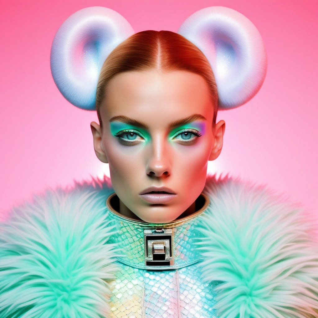 high fashion irish woman, top model portrait, haute couture fashion outfit, pastel elegance, by Jeremy Scott, Dramatic lighting, Autostereogram, Pearlescent colors, Furry texture. Andre Courreges's fashion design depicting