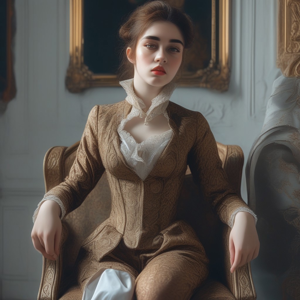 Baroque style. The girl is dressed in the most fashionable, while being very erotic. She looks arrogantly at the man sitting in the chair.