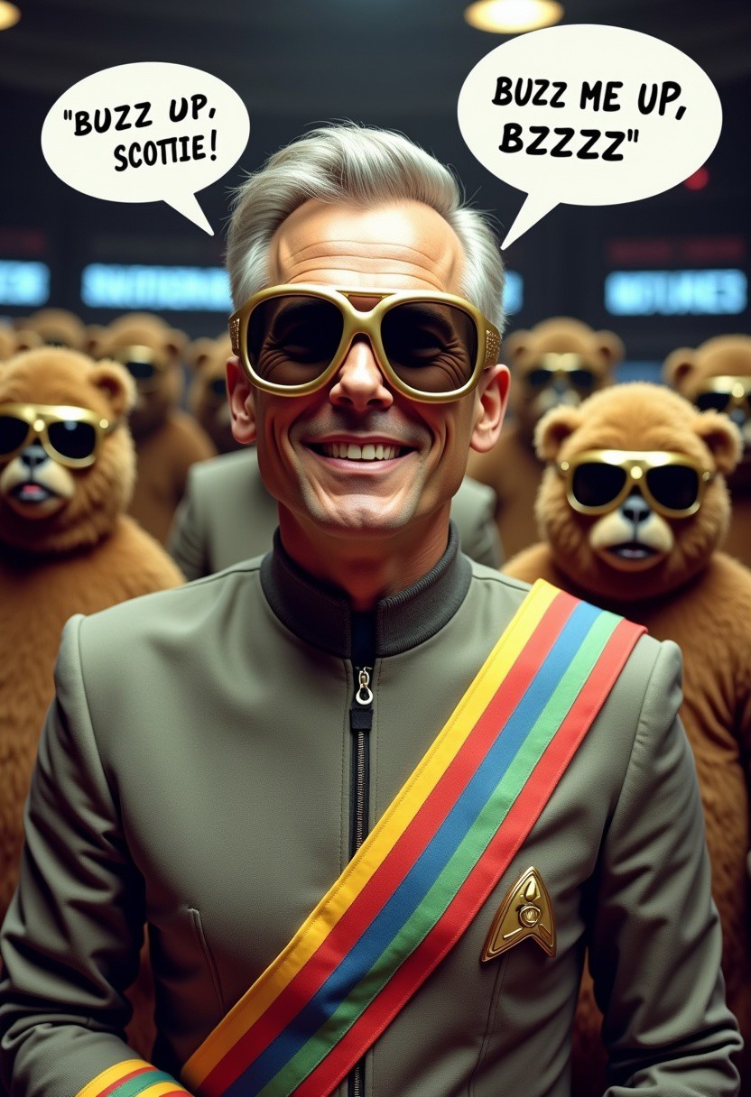 A satirical image of a startrek astronaut with exaggeratedly large, almost comical golden sunglasses that stretch wide across their face, revealing perfectly aligned, gleaming teeth. The hero is dressed in a sharp, classic space suit with a bright rainbow lines diagonally across the shoulder, standing in a space control center with the an audience of ewoks in the background. Their posture is confident and charismatic, but the overly large sunglasses give the image a humorous and slightly unsettling tone. His hair is silvrer, Above the astronauts head, a speech bubble reads in scribbled letters, "Buzz me up, Scottie! Bzzzzzz" . The background features a blurred crowd, adding depth but keeping the focus on the captain's exaggerated expression.