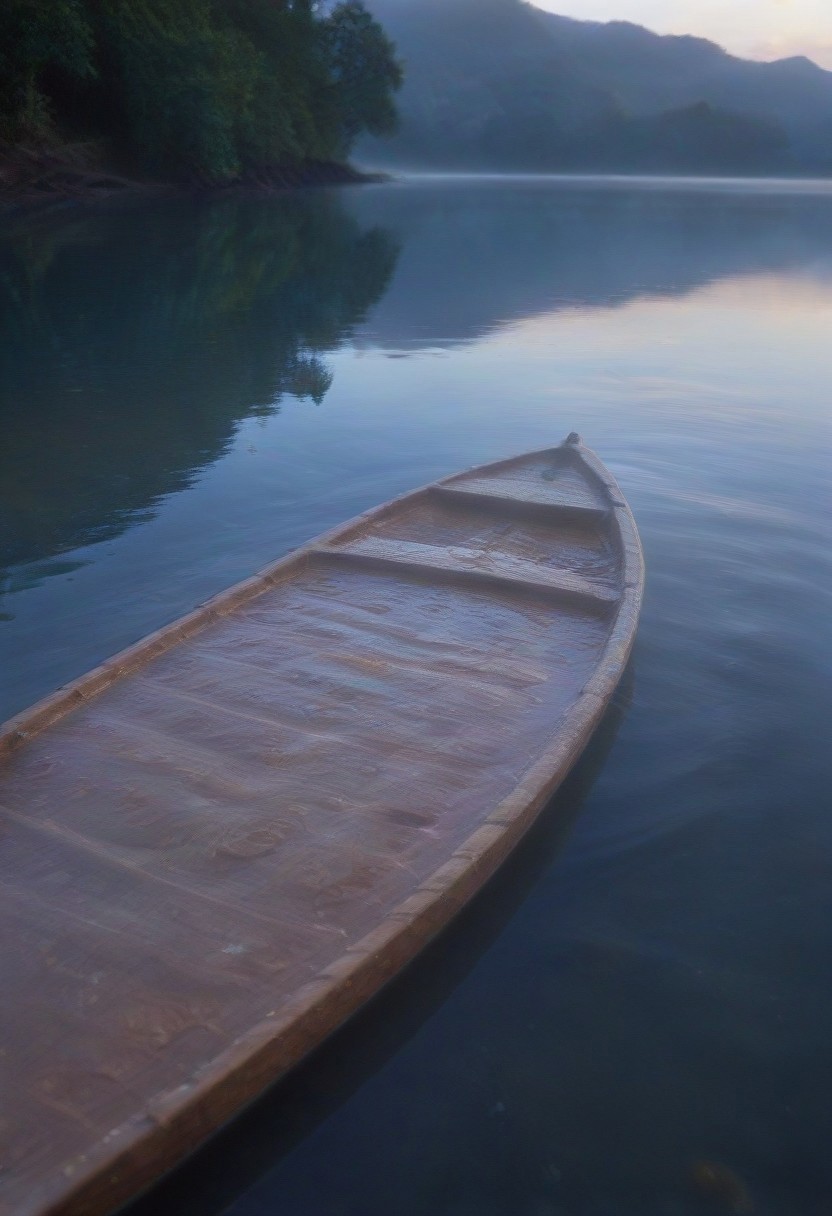 a small wooden boat, floating on calm reflective water, cyan hills in the background, soft mist hovering above the water, golden sunlight casting a warm glow, intricate wood carvings on the boat, gentle ripples in the water, lush vegetation on the distant hills, detailed reflections on the water, a few scattered clouds in the sky, vibrant colors, cinematic composition
