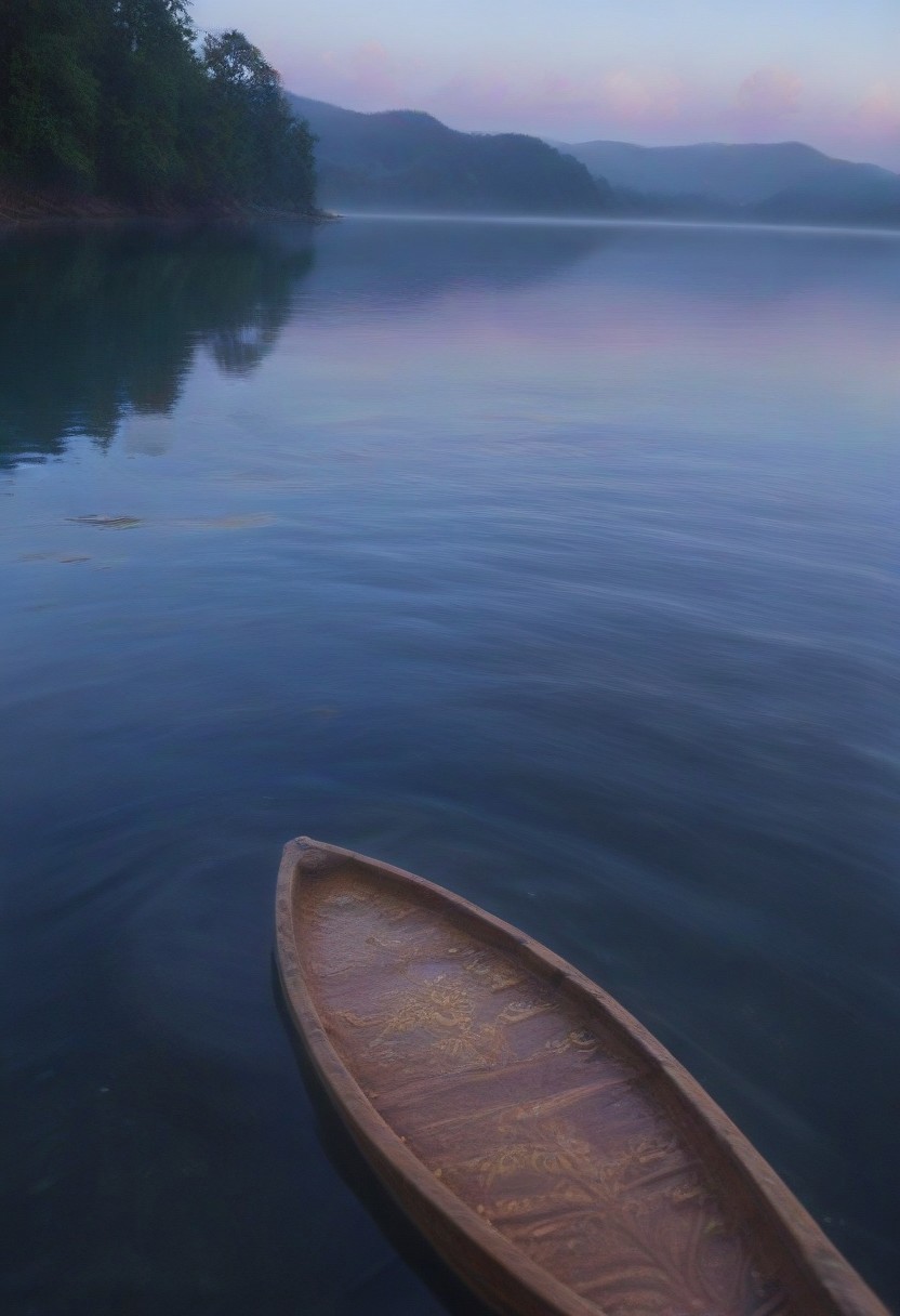 a small wooden boat, floating on calm reflective water, cyan hills in the background, soft mist hovering above the water, golden sunlight casting a warm glow, intricate wood carvings on the boat, gentle ripples in the water, lush vegetation on the distant hills, detailed reflections on the water, a few scattered clouds in the sky, vibrant colors, cinematic composition