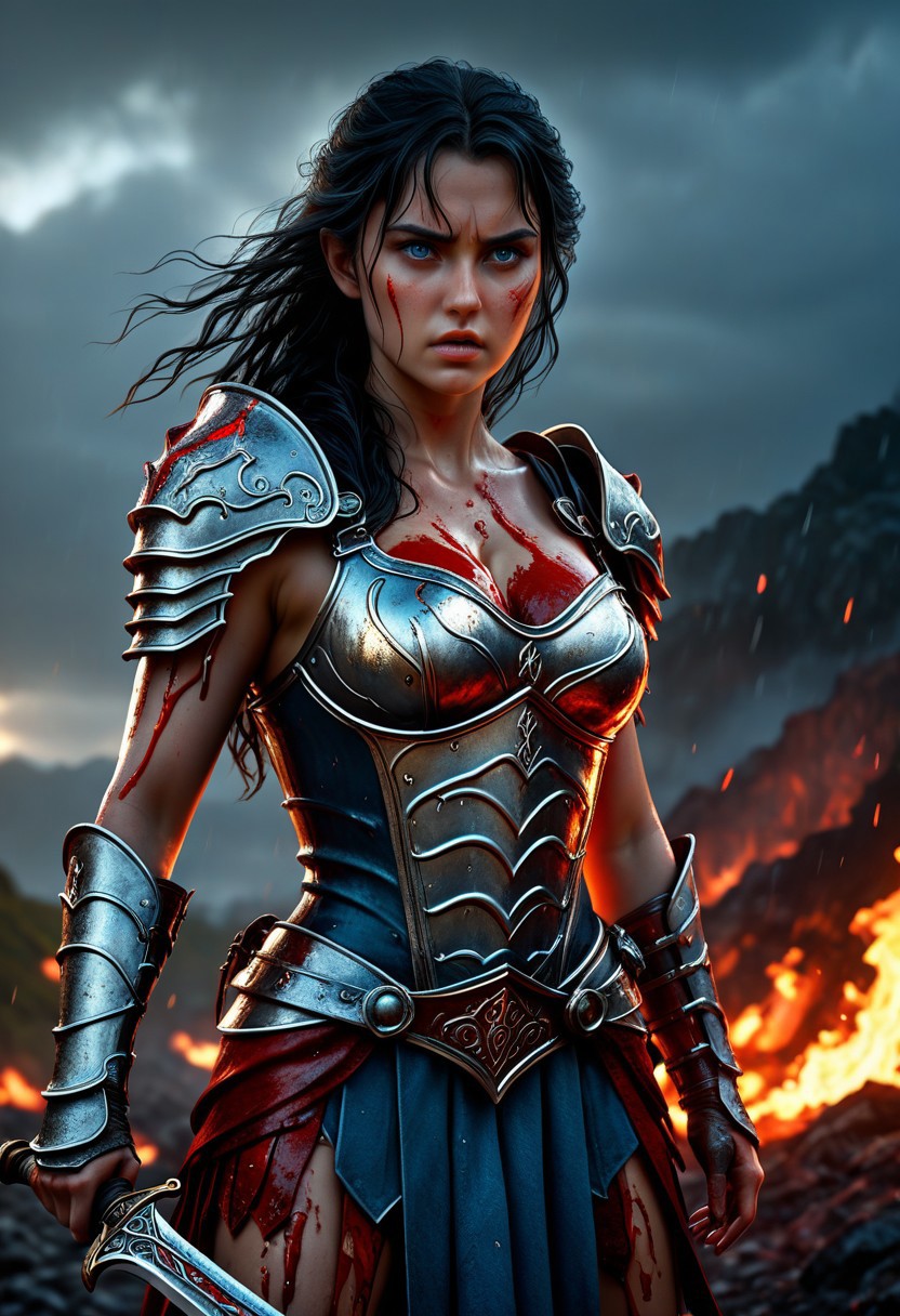 High resolution ultra-realistic of Beautiful burly Warrior girl, 8k, capturing the intensity of the moment, cinematic lighting, standing on a bloody and stormy Battleground in a fighting pose, wavy black hair, realistic bloody dirty pale face, realistic blue eyes, fire, intricately designed iron and silver medieval armor, red mini skirt, LOTR Aesthetic, perfect athletic figure, beautiful Warrior girl, fire, ultra realistic, cinematic style, athletic figure, dark fantasy, dramatic lighting, wet and sweaty skin, dirty skin, athletic figure, dark medieval, dramatic lighting, Greg Rutkowski style,, Warrior girl on in iron armor, hyper-detailed, hyper-realistic, bright colours, Attractive 25 old years girl, Attractive, beautiful firm Breasts, sharp focus, digital painting, Photograph Taken on Nikon D750, Alphonse Mucha, 8K, athletic figure, Hyperdetailed, hyperrealism, Attractive, Attractive bust girl, asymmetric balance