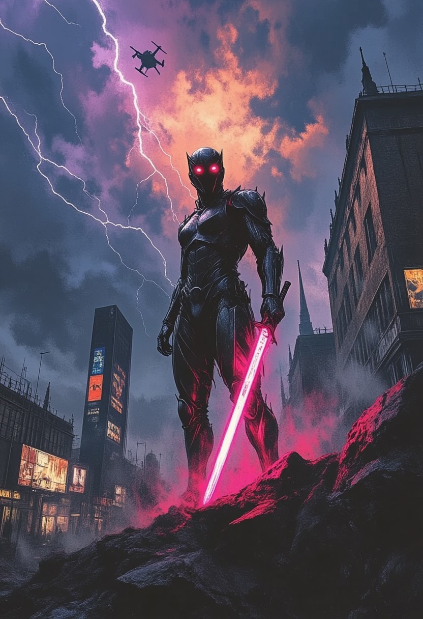 A shattered dystopian metropolis sprawls beneath a storm-torn sky, where turbulent clouds churn with streaks of violet and fiery orange, illuminated by jagged lightning that cuts through the gloom. The air is alive with the chaos of a soulstorm—an ethereal tempest of swirling, spectral energy that spirals through the ruins, its glowing trails pulsing with hues of cyan, crimson, and ghostly silver. Sharp, directional lighting breaks through the chaos, casting dramatic shadows that ripple across the cracked surfaces of the decayed cityscape. In the foreground, a close-up reveals a lone figure standing amidst the storm. His armor, a blend of matte black plating and glowing red circuitry, glistens with droplets of rain and spectral light as arcs of energy reflect off its surface. The figure grips a humming plasma blade, its shifting magenta glow illuminating their tense posture and the twisted tendrils of fog that coil around his feet.His visor flashes with a faint amber glow, concealing their expression as the storm’s howling winds whip past them. Behind, colossal drones hover silently, their searchlights cutting through the haze, while towering ruins flicker with remnants of holographic propaganda. The soulstorm intensifies, lightning illuminating the ghostly forms of spectral beings caught within its grasp, their haunting wails echoing across the desolate landscape. The figure’s silhouette stands defiant, a stark contrast against the chaos and destruction swirling around them.