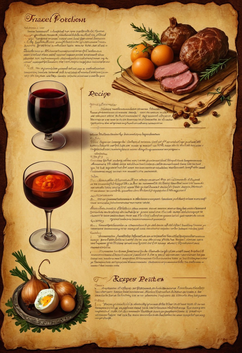 An illustrated medieval recipe of a "Sex Potion" made with ingredients including: (Chickpeas, goat testicles, lamb fresh meat, sparrows brains, bird egg yolks, pepper, wine, roasted onions, carrot juice, butter), ancient british, Gothic, parchment page, *important note: please don't follow the recipe. it’s probably best not to try these at home.* concept-art, fantasy, epic, majestic, magical, dreamy, perspective, light and shadow, moody, epic, beautiful, painterly, aesthetic, textural, intricate details, highly detailed, ultra-detailed, absurdres, aid291, cs-l3ath3r