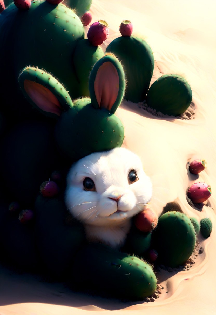 score_10, score_9_up, score_8_up, score_7_up, score_6_up, vibrant colors, shiny_skin, prefect lighting, detailed image, snoozing, masterpiece, best quality, highly detailed, ultra quality, BREAK, <lora:Prickly Pear Style v1:1>, Prickly Pear Style, epic photo of rabbit, desert, cactus, Sand, dune, <lora:xl_more_art-full_v1:1> , <lora:add-detail-xl:1> ,