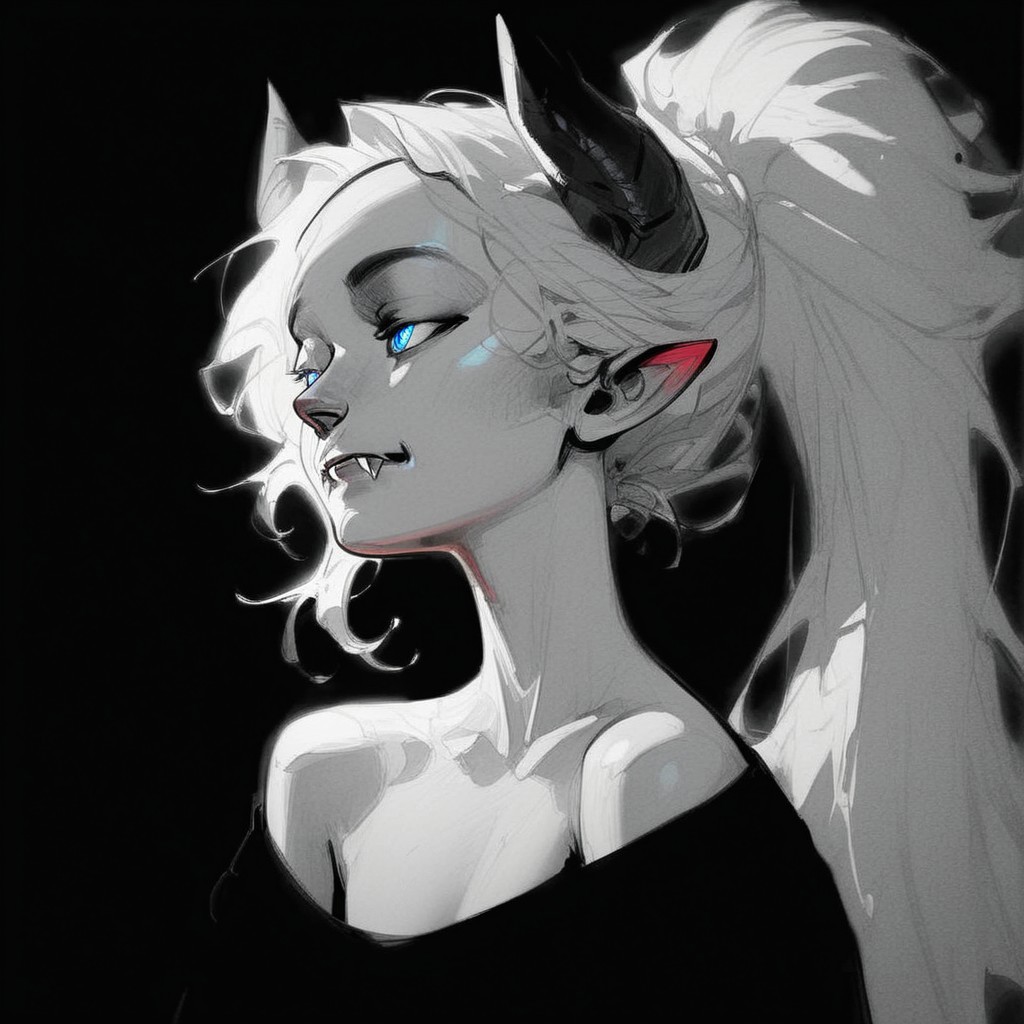 (Blend_in, black background), score_9, score_8_up, score_7_up, (sketch, monochrome, greyscale, spot color, sidelightning, cowboy shot, upper body), mature, beautiful, stunning, Lynn Pink, blue eyes, ponytail, tail, horns, pointy ears, fangs, (((adult))), small breasts, simple black shirt, long sleeves, off shoulder, no bra, looking away, head turned to the side, arms at sides