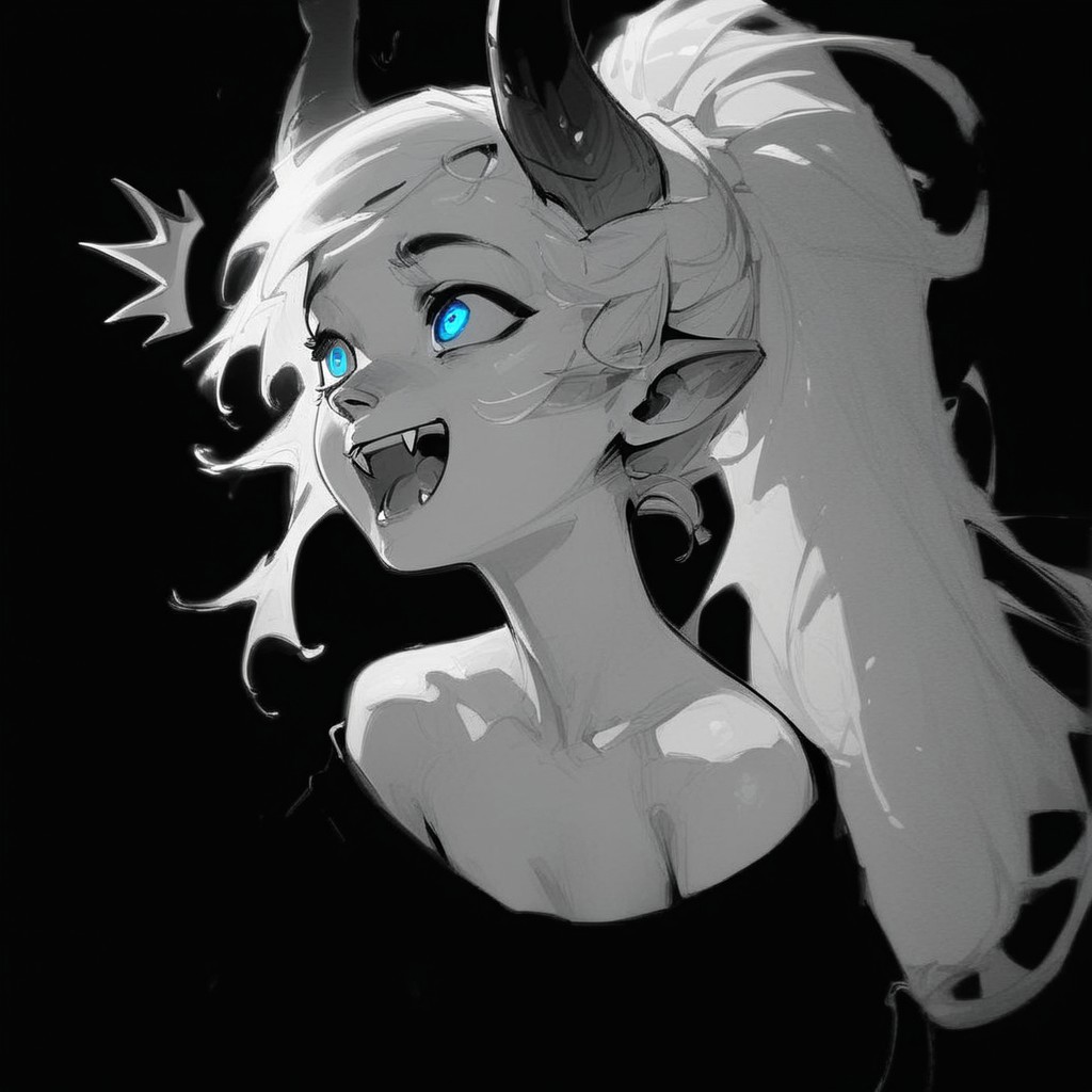 (Blend_in, black background), score_9, score_8_up, score_7_up, masterpiece, best quality, absurdres, vibrant, highly detailed, sketch, monochrome, greyscale, spot color, upper body, 1girl, Lynn Pink, blue eyes, ponytail, tail, horns, pointy ears, fangs, (((adult))), small breasts, simple black shirt, long sleeves, off shoulder, no bra, happy, (^^, :D:1.5)