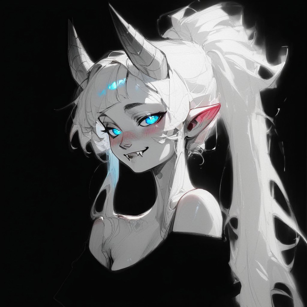 (Blend_in, black background), score_9, score_8_up, score_7_up, masterpiece, best quality, absurdres, vibrant, highly detailed, sketch, monochrome, greyscale, spot color, portrait, Lynn Pink, blue eyes, blush, ponytail, tail, horns, pointy ears, fangs, (((adult))), small breasts, simple black shirt, off shoulder, no bra, looking at viewer, seductive smile
