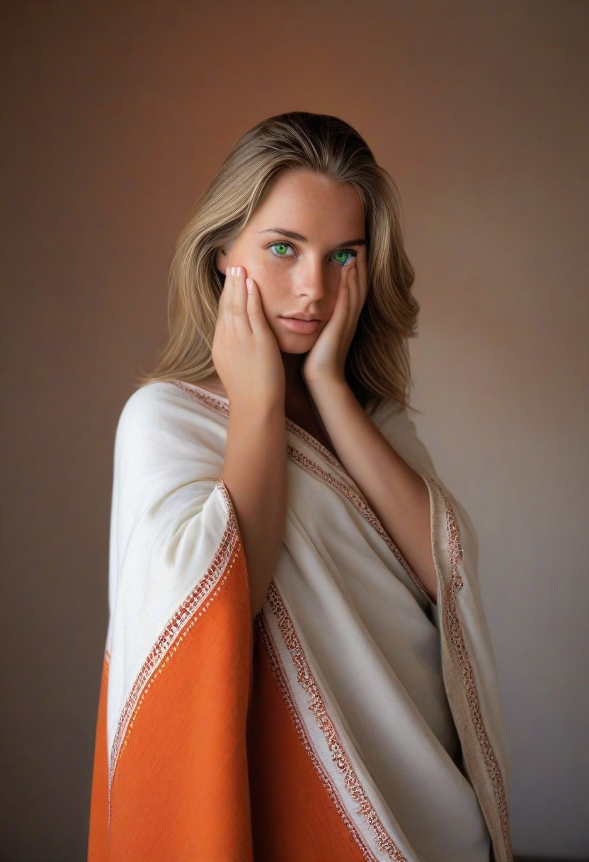 Create a highly detailed and emotionally powerful ((full body)) portrait reminiscent of Steve McCurry’s renowned style. The subject should be a young 35 years old nordic (mythical female centaur) with expressive eyes that convey a deep and compelling story, striking full body portrait of a woman wrapped in an elegant linen, red and light orange borders, embroided in fine linen flowing mantle, covering part of her beautiful face. Her skin should be portrayed with natural, authentic texture, highlighting subtle details that add to the realism. The linen elegantly frames her green eyes in a V shape, naturally covering part of her face. drawing attention to their intensity. Capture the intensity and depth of her gaze, ensuring that her eyes are the focal point of the image. Part of the face is covered to center the attention on her eyes, Use soft lighting to enhance the texture of her skin and the vibrancy of her clothing, while maintaining a bokeh background. National Geographic Photo Style. (Mario Testino, Irving Penn, Gregory Crewdson, Sebastiao Salgado best style to use.) (mythical female centaur, tall, long torso, ((((four legs)))), long horse legs, tall, long torso, athletic build, gorgeous anglo super model), full body, from front, face and eyes are the focus of the picture, photorealistic, awesome beauty and intensity.