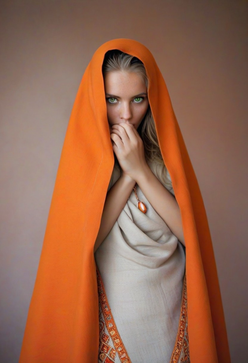 Create a highly detailed and emotionally powerful ((full body)) portrait reminiscent of Steve McCurry’s renowned style. The subject should be a young 35 years old nordic (mythical female centaur) with expressive eyes that convey a deep and compelling story, striking full body portrait of a woman wrapped in an elegant linen, red and light orange borders, embroided in fine linen flowing mantle, covering part of her beautiful face. Her skin should be portrayed with natural, authentic texture, highlighting subtle details that add to the realism. The linen elegantly frames her green eyes in a V shape, naturally covering part of her face. drawing attention to their intensity. Capture the intensity and depth of her gaze, ensuring that her eyes are the focal point of the image. Part of the face is covered to center the attention on her eyes, Use soft lighting to enhance the texture of her skin and the vibrancy of her clothing, while maintaining a bokeh background. National Geographic Photo Style. (Mario Testino, Irving Penn, Gregory Crewdson, Sebastiao Salgado best style to use.) (mythical female centaur, tall, long torso, ((((four legs)))), long horse legs, tall, long torso, athletic build, gorgeous anglo super model), full body, from front, face and eyes are the focus of the picture, photorealistic, awesome beauty and intensity.