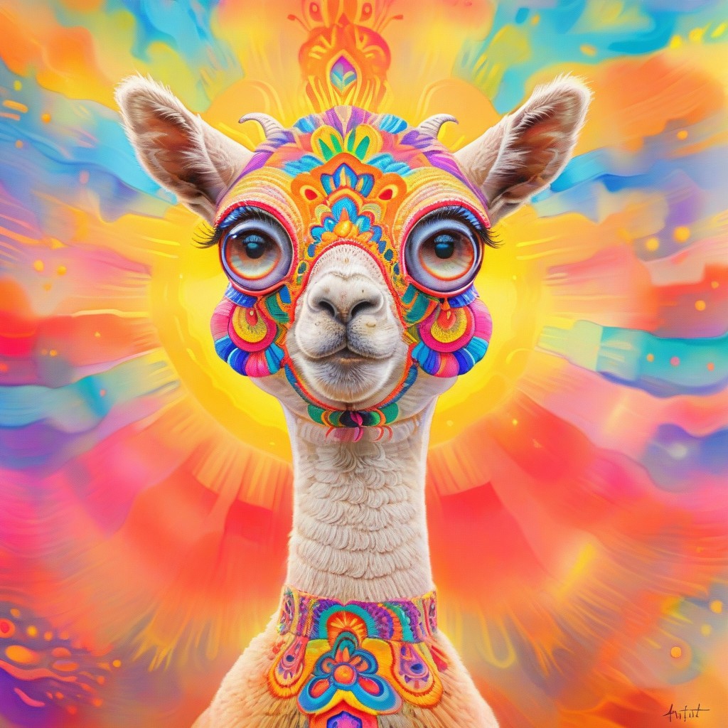 Radiant, big-eyed alpaca. at Sunset, abstract art by Anne Truitt, Synthetism, psychedelic colors, psychadelicchaos, psychadelic, sharp focus, highly intricate, full color, confident, intricate artistic color, handsome