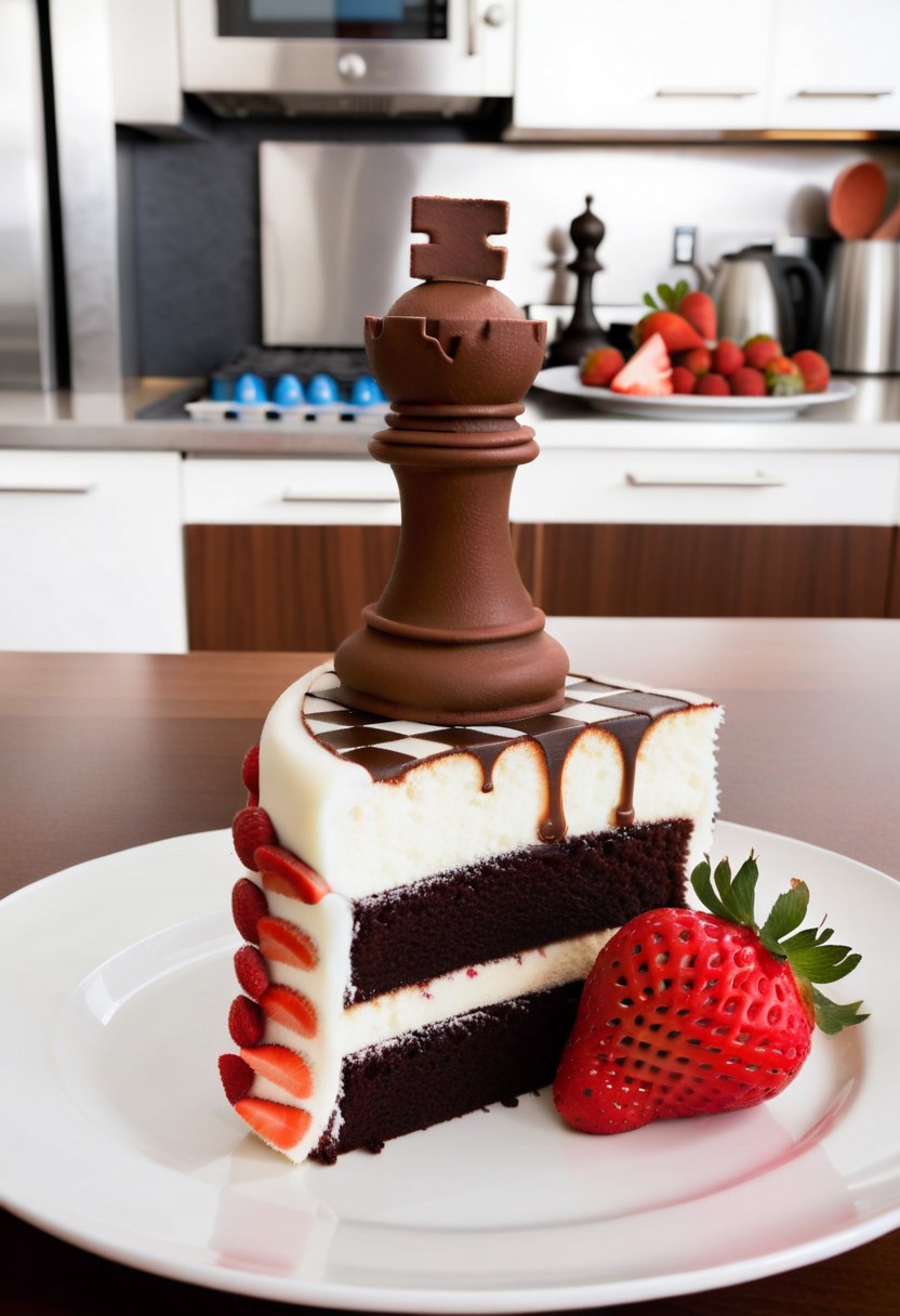(A cake that looks like a chess piece), with a slice cut off revealing the strawberry/chocolate interior. The cake is on a plate shaped like a chess board. The background is a kitchen. Realistic shot, shot on hasselblad X2D. High resolution.