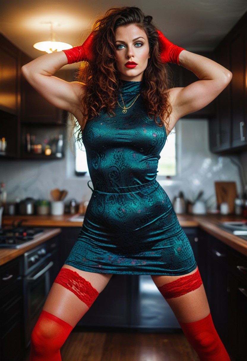 PsychadelicChaos, psychadelic, (sharp focus:1.2), sexy, round cheeks, upturned nose, (detailed eyes:1.1), (luscious lips:1.1), (large eyes:1.0) (chestnut hair:1.2) (moody lighting:1.2), depth of field, bokeh, 4K, HDR. hyper realistic, realistic eyes, (absurd res:1.1), beautiful lighting, sunlight, score_9, score_8_up, score_7_up, score_6_up, score_9, score_8_up, score_7_up, score_6_up, masterpiece, high quality, (best quality:1.1), milf, horny, 1girl, perfect red lips, parted lips, thick thighs, wide hips, (massive breasts:1.1), Chestnut hair, big hair, wavy hair, green eyes, wide hips, bubble butt, red stocking, hands behind head, standing, looking at viewer, photoshoot, kitchen, ad-detail-xl, 34 years old, Solo, hair decoration, black makeup, necklace, short dress with red fur, elbow gloves, black knee boots. Older woman., (muscular:1.9), (toned body:1.6), red lips, strong, secure, confident, (slim waist:1.9), (wide hips:1.9), XenaXL, realistic, real face, hyper realsitic, influencer, insta influencer, beautiful, sexy, pretty, (green smoke:2.3), (red smoke:2.3), (blue smoke:2.3),