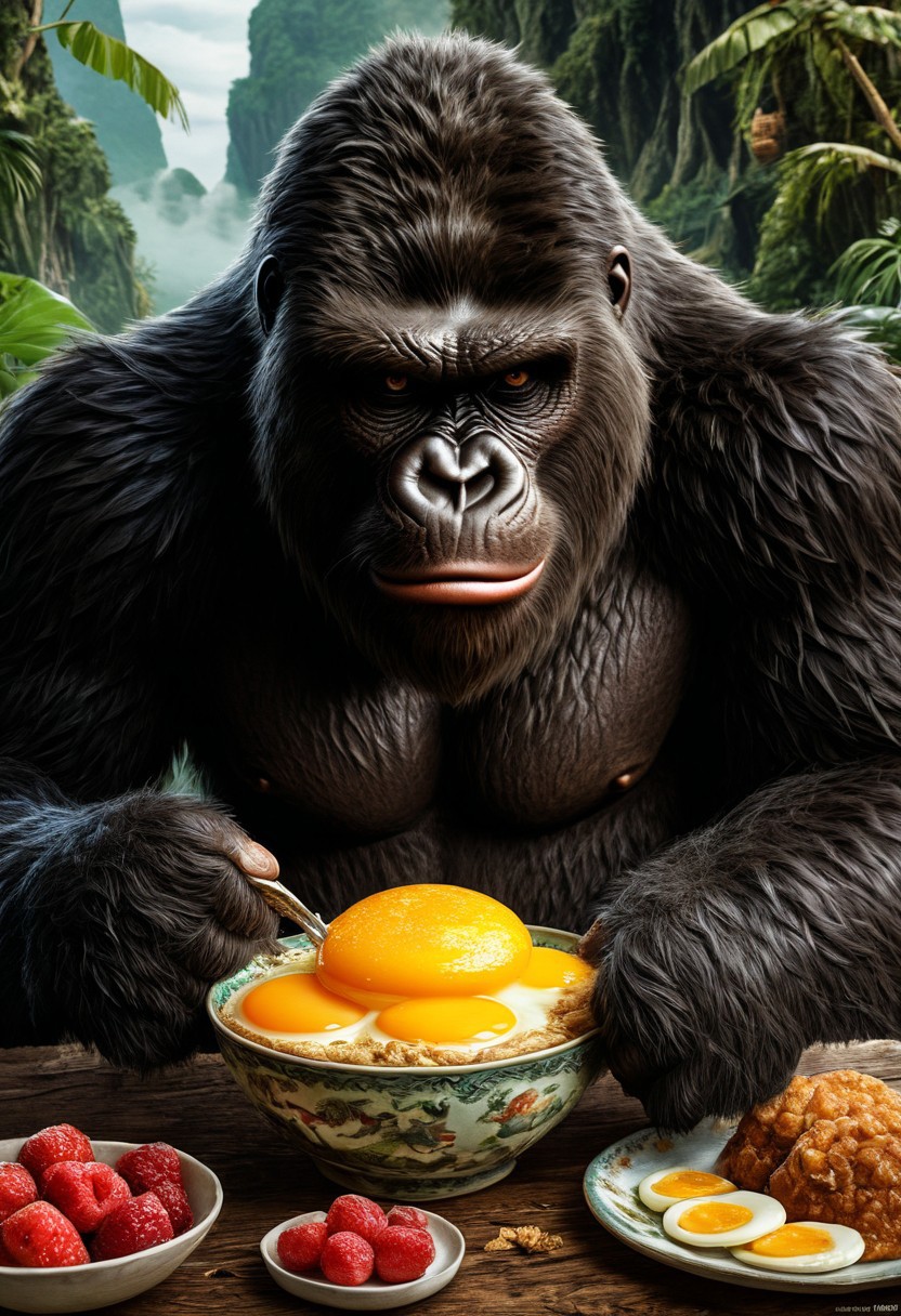 Ba-kong, Favorite breakfast treat of King Kong. (no human), characters, digital, dreaminess, environmentalism, fantasy, femininity, manga-anime, whimsy, dark, magic, other-worldliness, surreal, beautiful, painterly, aesthetic, textural, intricate details, highly detailed, ultra-detailed, absurdres, aid291, fighting stance