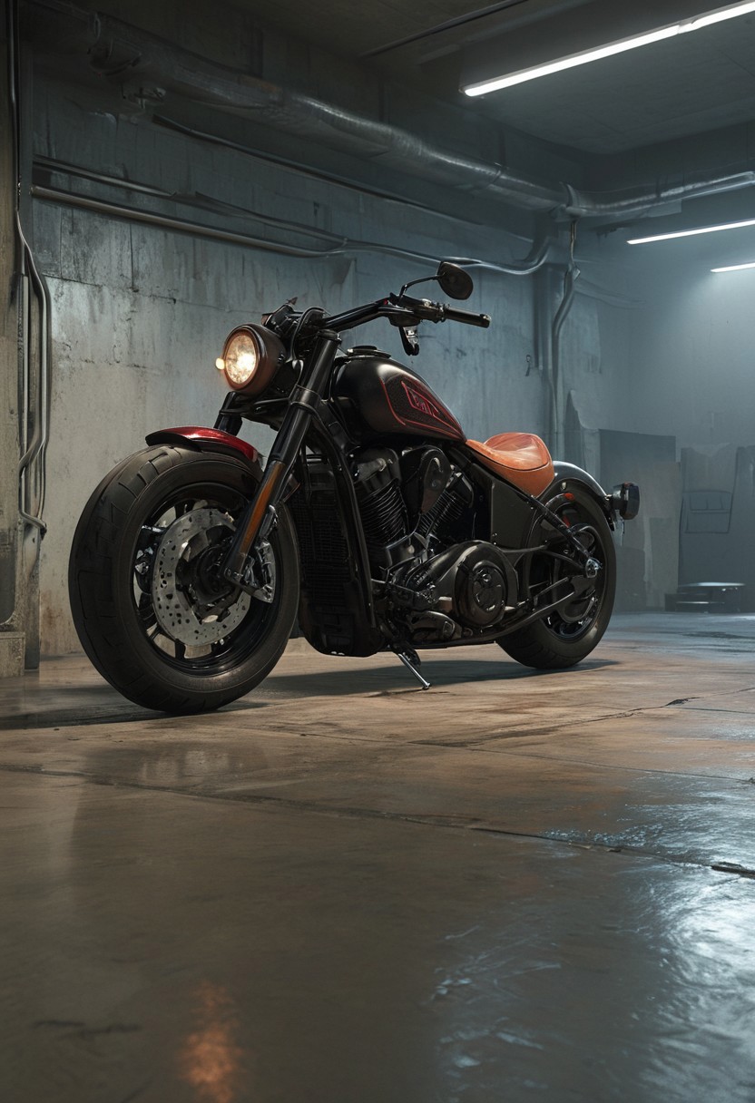 score_9, score_8_up, score_7_up, high detailed, hyper realistic, 8k, 16k, masterpiece, CGI rendering. An **Indian Chief Dark Horse**, its **matte black body with crimson pinstripes**, parked in a **deserted underground parking lot**, partially illuminated by a **single overhead spotlight**. The **sculpted V-twin engine, leather-wrapped saddlebags, and elongated fenders** exude a bold, vintage presence. The **cold concrete floor beneath reflects the dim artificial light**, with **scattered dust and faint tire marks adding a raw, gritty atmosphere**. In the background, **thick concrete pillars fade into darkness, faint red and blue neon glows flickering from distant emergency exit signs**. The **air is filled with a subtle haze, amplifying the moody, cinematic ambiance**. The **license plate marked with the number 76** sits discreetly beneath the rear fender, catching a faint glint of light. The hyper-realistic rendering captures **the fine dust settling on the fuel tank, the soft glow of the chrome details, and the deep shadows emphasizing the bike’s aggressive stance**, creating a **perfectly composed scene of solitude, power, and raw mechanical beauty**.