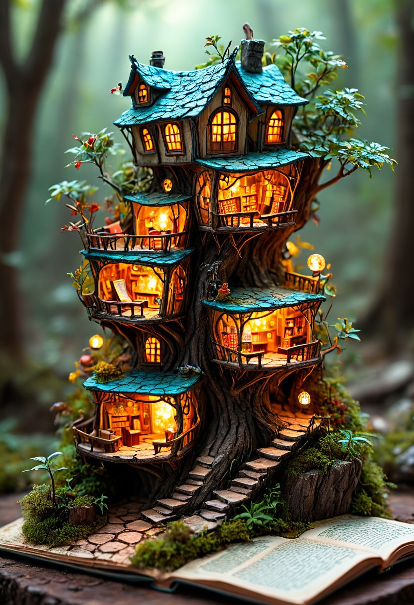 tilt-shift macro photo, best quality surreal double exposure painting on cracked paper, tiny enchanted fantasy forest library, miniature glowing bookshelves, intricate treehouse structures, minuscule fairies reading, microscopic lanterns illuminating cracked-paper pathways, insanely detailed surreal textures, selective focus, blurred whimsical background, vibrant colors, hyperdetailed foliage, centered composition, cinematic angle, perspective control, <lora:Midjourney_-_SemiReal_Dreams_FLUX_LoRA:1>,<lora:hyper-detail-illustration:1>