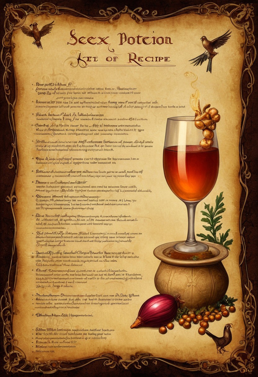An illustrated medieval recipe of a "Sex Potion" made with ingredients including: (Chickpeas, goat testicles, lamb fresh meat, sparrows brains, bird egg yolks, pepper, wine, roasted onions, carrot juice, butter), ancient british, Gothic, parchment page, *important note: please don't follow the recipe. it’s probably best not to try these at home.* concept-art, fantasy, epic, majestic, magical, dreamy, perspective, light and shadow, moody, epic, beautiful, painterly, aesthetic, textural, intricate details, highly detailed, ultra-detailed, absurdres, aid291, cs-l3ath3r