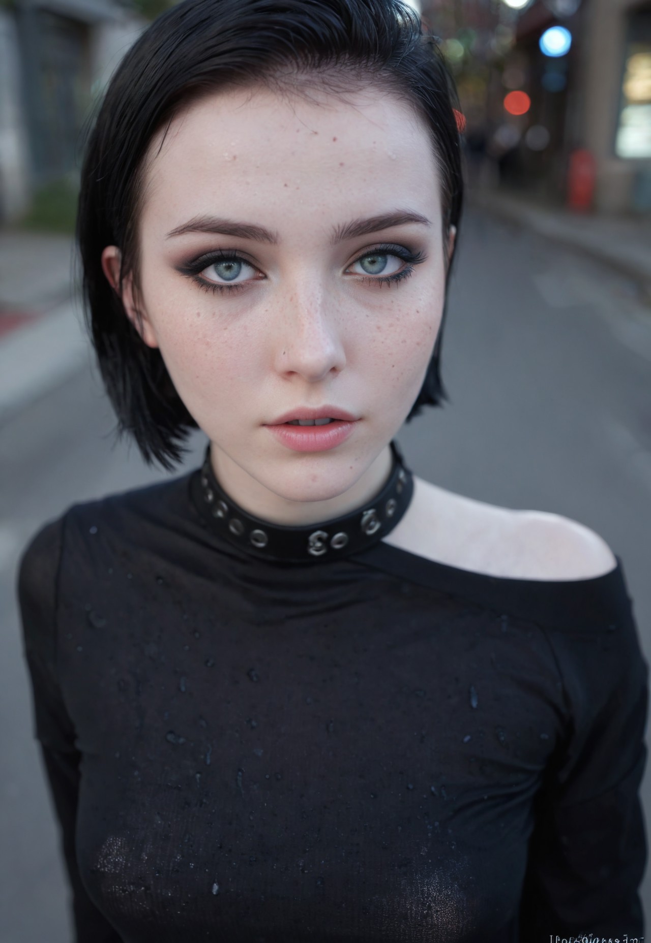 safe_pos, score_9, score_8_up, score_7_up,source_photo, ultra hd, (high res ima), hyper-detailed image, goth, detailed eyes, hyper-realistic,futa,shemale, futanari, trans girl, femboy, (love expression). Depth of field, bokeh, 35mm lens, adorable, detailed skin, (white pale skin:1.2), cute, black girl, innocent and alluring, very short hair, black hair, standing by the street, goth clothes, emor hair, beautiful eyes, freckles, flat breasts:1.6, slim, cleavage, tight body, slutty, hourglass figure, lovely, (snowless winter street), sweat, choker, lowered off-shoulder shirt,dynamic angle, low lighting, amazing light, ( anties ), ge,masterpiece,best quality,cute face,,ultra detailed eyes, cleavage,from above