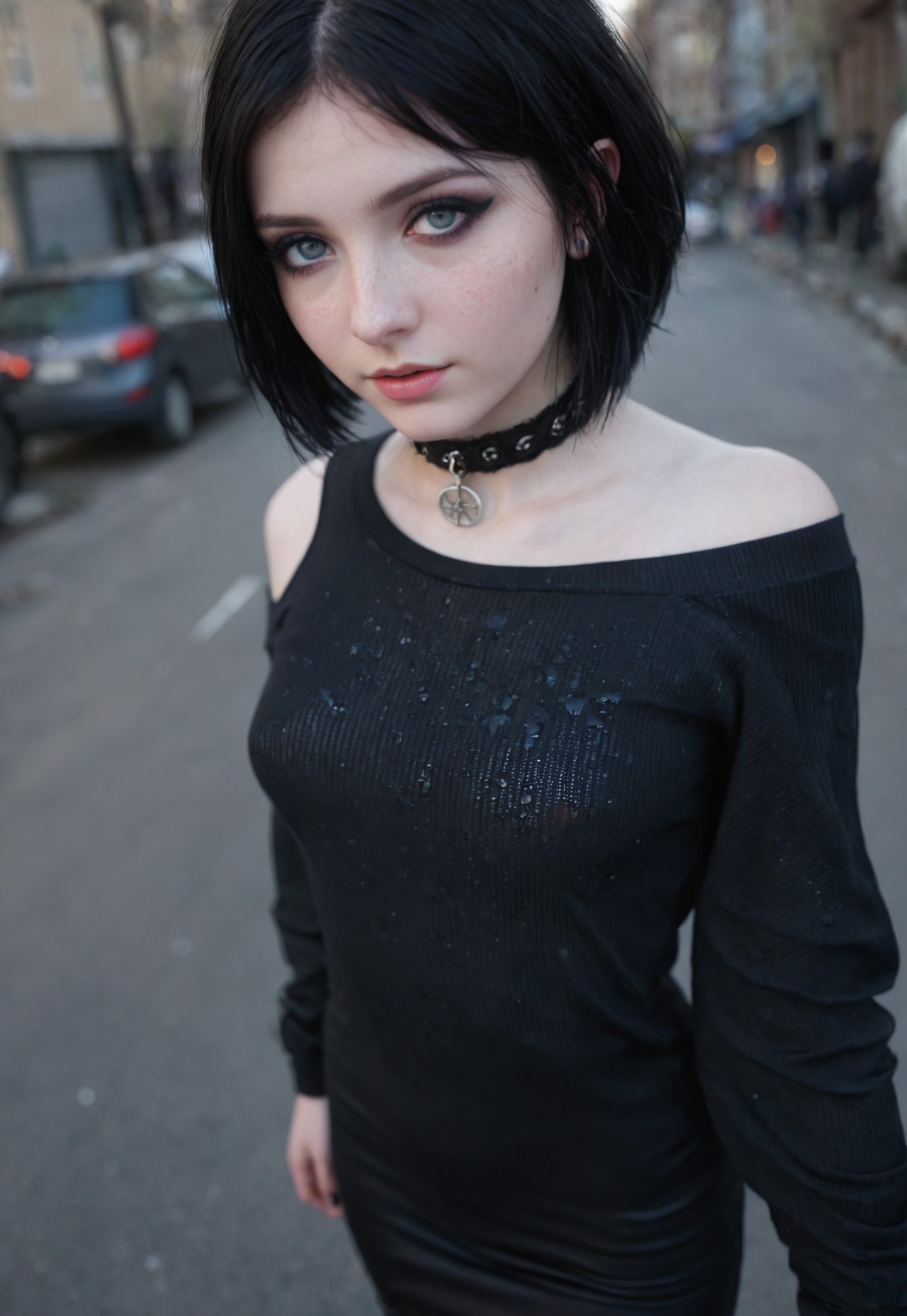 safe_pos, score_9, score_8_up, score_7_up,source_photo, ultra hd, (high res ima), hyper-detailed image, goth, detailed eyes, hyper-realistic,futa,shemale, futanari, trans girl, femboy, (love expression). Depth of field, bokeh, 35mm lens, adorable, detailed skin, (white pale skin:1.2), cute, black girl, innocent and alluring, very short hair, black hair, standing by the street, goth clothes, emor hair, beautiful eyes, freckles, flat breasts:1.6, slim, cleavage, tight body, slutty, hourglass figure, lovely, (snowless winter street), sweat, choker, lowered off-shoulder shirt,dynamic angle, low lighting, amazing light, ( anties ), ge,masterpiece,best quality,cute face,,ultra detailed eyes, cleavage,from above