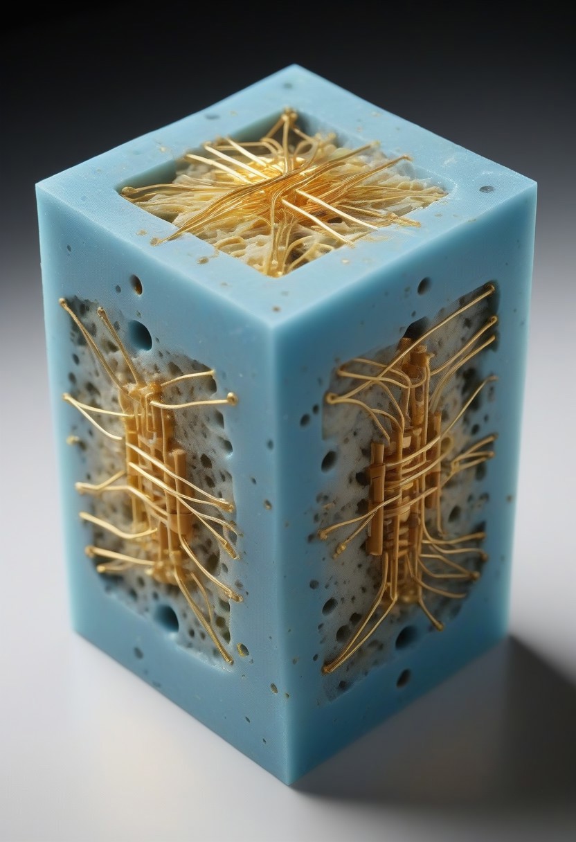 Soap film dendrite 9th level Menger sponge mating with nixie tubes but made of diaphanous Stilton cheese aerogel interwoven with thin copper tubing and gold wire circuitry stolen from a 2nd generation quantum computer.