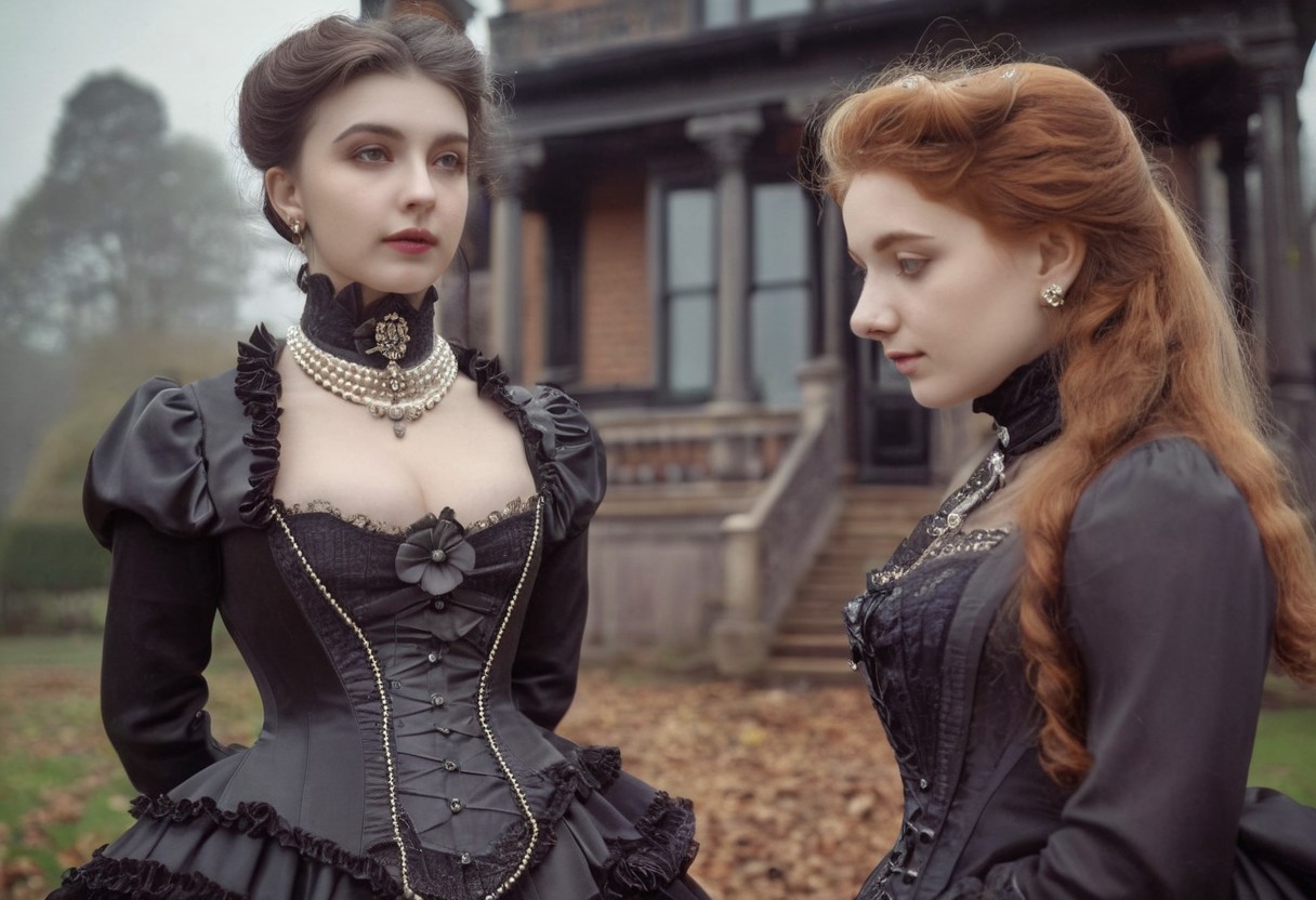 cinematic film still, cinematic lighting, photorealistic, photographic, epic photography, analog film stocks style, Alcina Dimitrescu a woman in a black Victorian bustle dress and a purple tight corset, 1girl, solo, looking at viewer, closed mouth, smile, large breasts, long blonde curly hair, cleavage, earrings, necklace, black dress, black clothing, dark purple corset, pale skin, pearl necklace, black flower, black rose, beautiful victorian woman. in front of a Victorian mansion, old victorian mansion, old victorian House, woman is outside, perspective full body shot, horror themed, dark and mysterious atmosphere, foggy, resident evil style, dark, spooky