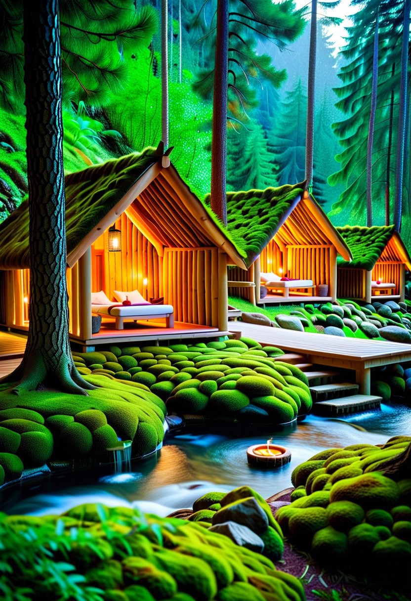 (((A tranquil spa resort nestled in a lush valley, where treatments involve massaging clients with warmed slices of cedarwood-infused oils and wrapping them in soothing moss masks. Guests relax in hot springs tinted a gentle amber hue, sipping herbal teas infused with pine notes. One guest attempts yoga poses inspired by tree shapes but ends up toppling backward into a pile of fluffy moss, earning chuckles from fellow visitors. Soft ambient music enhances the calming atmosphere. ))) rejuvenating retreat, sensory indulgence, accidental comedy, glowing details, atmospheric serenity, hyper-realistic textures. Relaxing and indulgent, merging wellness themes with woodland-inspired tranquility. ((Background: cascading waterfalls surrounded by verdant foliage, glowing lanterns casting soft light over pinecone-shaped cabanas.)) ral-pinecone