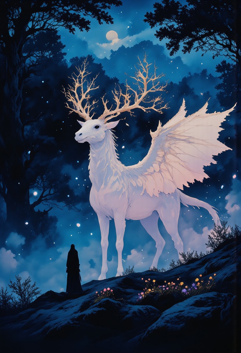 In the heart of an ancient, mystical forest, bathed in the eerie glow of a moon concealed behind thick, swirling clouds, strides a colossal dragonhound with translucent beautiful woven antler. Its massive paws thunder across the moss-covered ground as it moves effortlessly through the landscape, its transparent body nearly vanishing in the vast expanse of stars above. The creature’s form is translucent, barely visible against the endless cosmic canvas, with starlight piercing through its ethereal silhouette, casting a soft glow from within. The dragonhound’s faintly shimmering body takes on hues of deep blue and violet, refracting the distant starlight as it moves. Soft, iridescent mushrooms, glowing faintly in deep purple and emerald hues, sprout from the back of the massive beast, casting brief flickers of light that dance across the shadows of the forest floor. Its eyes, luminous and full of ancient wisdom, gleam as they gaze out from the shifting form, reflecting the brilliance of distant galaxies. The forest around it stretches endlessly, a labyrinth of twisted, ancient trees wrapped in dark, velvety moss, their branches reaching toward the sky like shadowed fingers. Hints of deep turquoise and dark purple swirl in the air, blending into the atmosphere, as though the entire realm is bathed in a palette of deep, enchanted twilight. The dragonhound’s silhouette moves gracefully through this dreamlike landscape, a serene giant in the midst of the cosmic night.