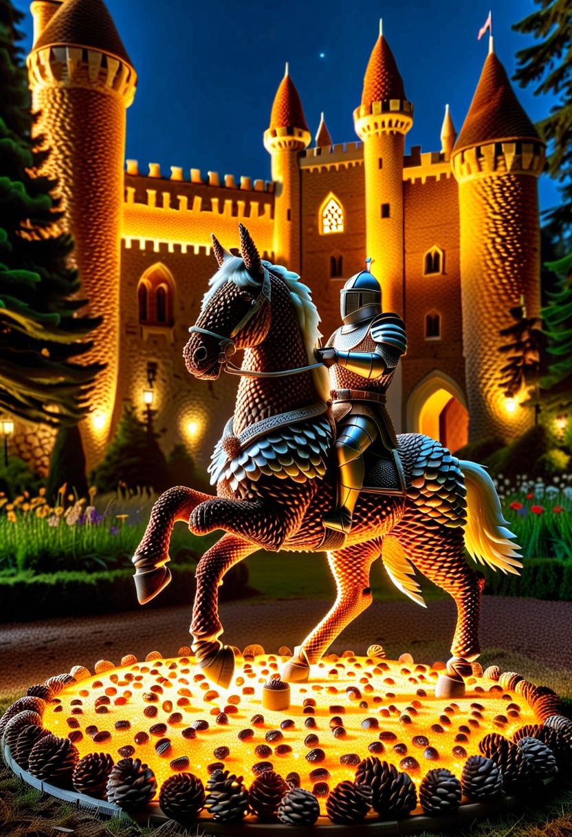 (((A medieval castle constructed entirely from crystallized pinecones, shimmering under moonlight like stained glass. Knights clad in armor polished to resemble shiny bark march across the courtyard, practicing jousting with lances tipped with candied sap. One knight loses grip on his lance mid-charge, sending it spiraling into a moat filled with bubbling amber liquid. His horse snorts indignantly as he sheepishly retrieves it. Rich textures and intricate carvings add regal elegance. ))) historical fantasy, rustic splendor, comedic combat, immersive world-building, vibrant aesthetics, glowing accents. Majestic and whimsical, merging chivalric themes with forest-inspired opulence. ((Background: sprawling gardens bursting with wildflowers, cone-shaped turrets reaching toward a cerulean sky.)) ral-pinecone