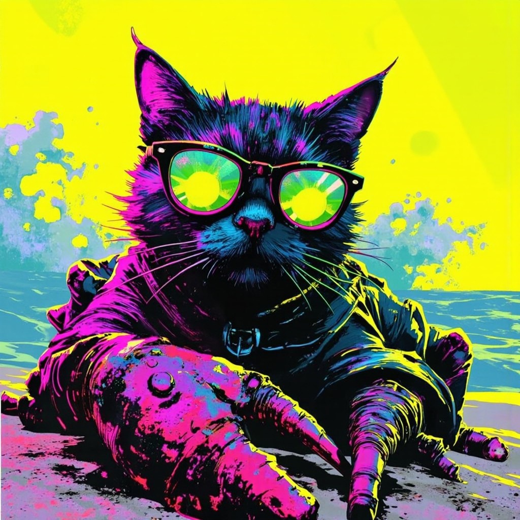 bo-neon, ArcaneFGTNR, a digital illustration in a vibrant, gothic style, A cat wearing cool sunglasses, lounging on a sandy beach with waves crashing behind. The lobster's red shell gleams in the sunlight, and its oversized sunglasses reflect the bright blue sky., in the style of hauntingly atmospheric dark fantasy, VHS, horror, 80's horror with vibrant colors the background is a solid, bright yellow, which contrasts sharply with vivid colors, stand out vividly, the overall composition is dynamic, high quality, ultra detailed, colorful, grainy, cyberpunk fantasy <lora:ArcaneFGTNR.safetensors:1.0> <lora:Flux\boFLUX Neon Abyss.safetensors:1.0>