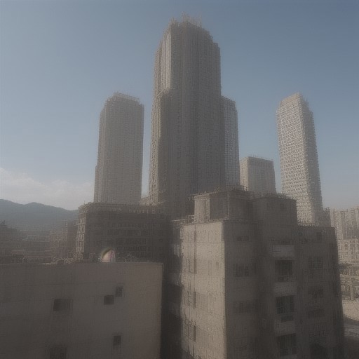 tall, narrow, tower, dystopian, black, Hong Kong, billboards, air conditioning units, short buildings around the main building, 2000s footage, nostalgic, vhs filter, construction, mountains in the background, vhs, airplane flying overhead