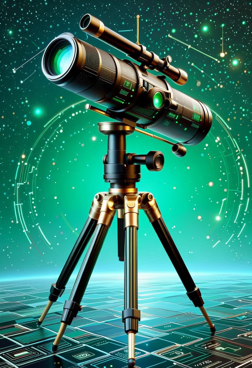 (((High quality, high resolution, extremely detailed, no humans, object focus, telescope, cybernetic enhancement upgrading lenses with quantum sensors capable of viewing alternate dimensions, neutral background, matte-black frame etched with glowing emerald glyphs representing star charts. The tripod legs house miniature processors analyzing real-time data, while hovering drones assist with calibration. Surrounding screens project discovered phenomena, immersing viewers in cosmic exploration. ))) astronomical wonder, glowing accents, hyper-detailed textures, scientific precision, celestial allure, immersive discovery. Intellectual and awe-inspiring, pushing the boundaries of space observation. ((Background: gradient fading from obsidian black to iridescent green, mirroring the telescope’s advanced capabilities.)) wm_cyber