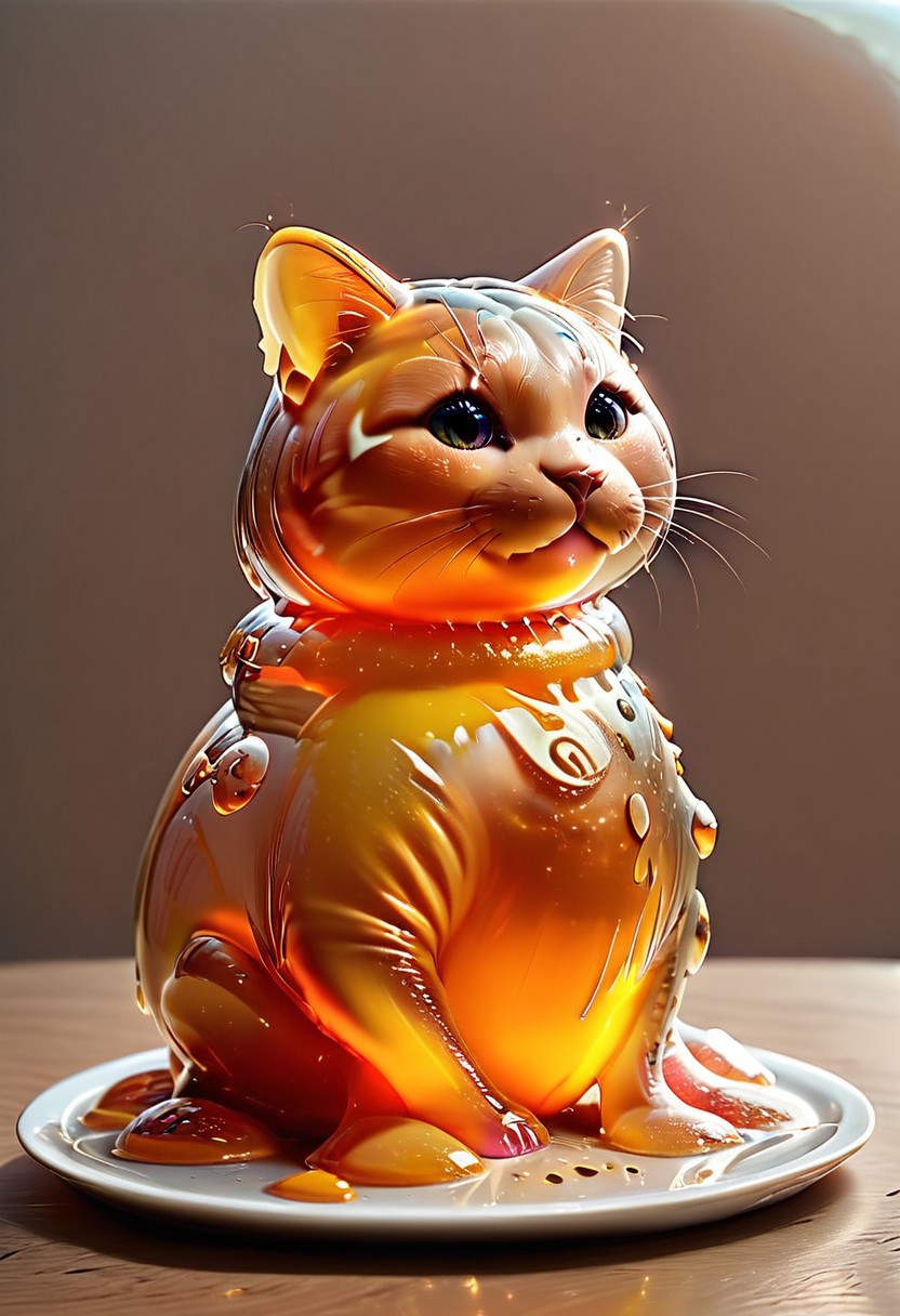 Score_9, score_8_up, score_7_up, rating_safe, concept art, digital art, realistic, a beautiful slime cat on a golden plate, smilong, cute, funny, detailed, sunset