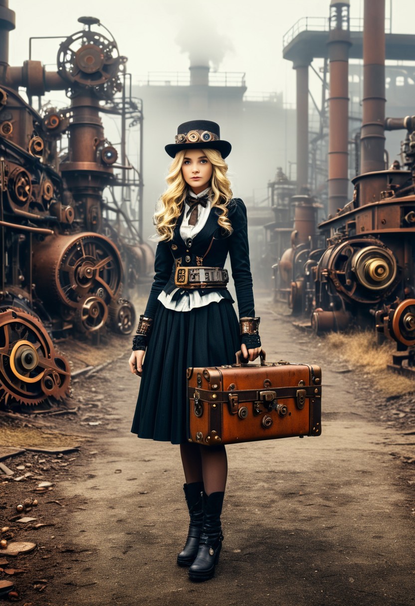 vintage photo, panoramic image, ultra realistic, fog, old factory, mechanical gearstyle complicated mechanical structure, gears, screws, springs. a little rusty factory, in focus 1girl, solo, (steampunk), blonde hair, hat, hold trunk case, , HD, masterpiece, best quality, ultra detailed