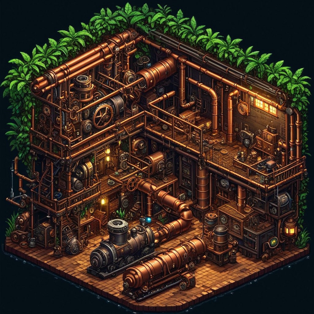 high detail, high quality, dramatic lighting, SFW, PG, detailed background, masterpiece, Graphic details, perfect design, Pixel_Art, Sprite, pixelart, game asset,isometric view, night, rain, steampunk workshop made of gears and copper pipes, jungle, steam coming form pipes