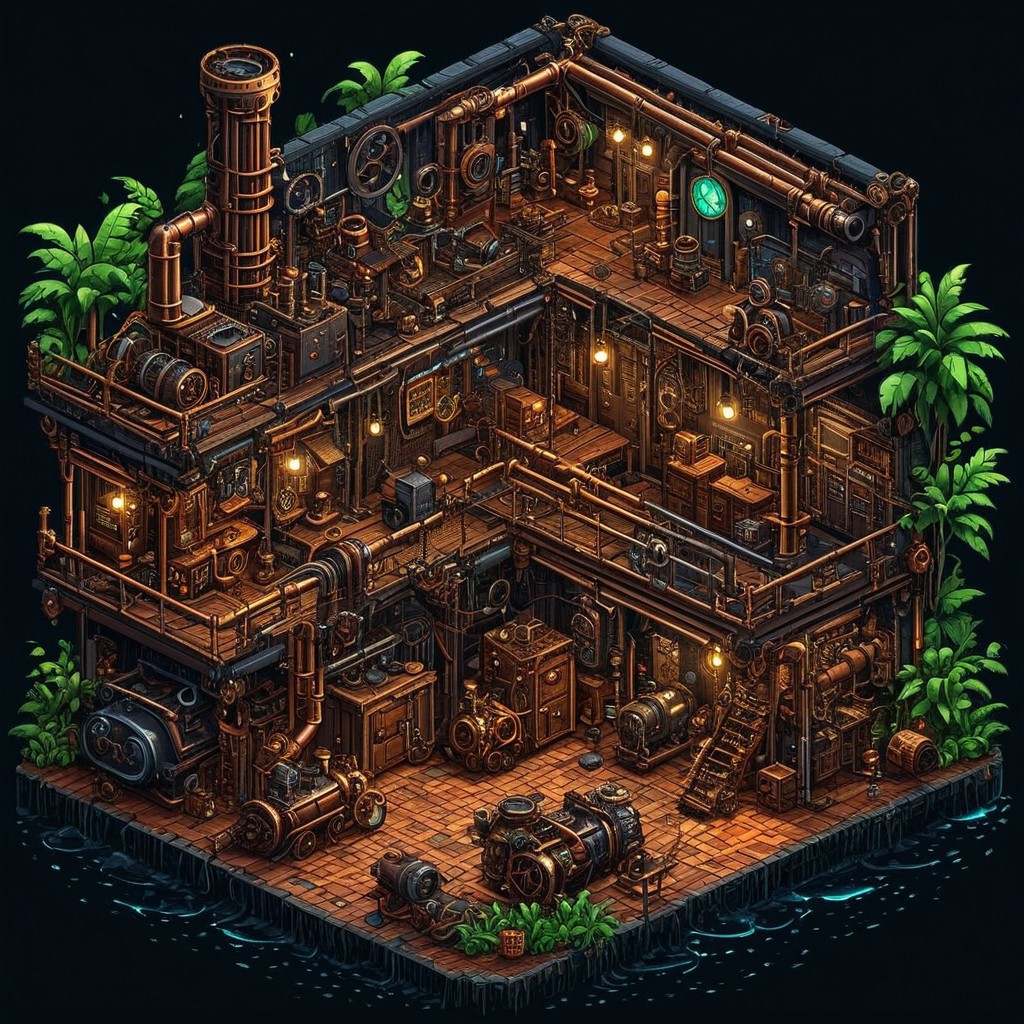 high detail, high quality, dramatic lighting, SFW, PG, detailed background, masterpiece, Graphic details, perfect design, Pixel_Art, Sprite, pixelart, game asset,isometric view, night, rain, steampunk workshop made of gears and copper pipes, jungle, steam coming form pipes