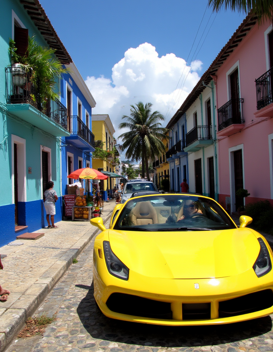 <lora:amateurphoto-6version:1> Amateur photography of , on flickr in 2007, 2005 blog, 2007 blog A realistic photograph of a vibrant Caribbean town during midday, featuring colorful colonial-style buildings painted in bright shades of blue, pink, yellow, and turquoise. The buildings have wooden shutters, wrought iron balconies, and lush greenery spilling from window boxes. The narrow, sunlit cobblestone street is bustling with local activity, with pedestrians walking along the sidewalks, street vendors selling fresh fruit, and children playing near the storefronts. A bright yellow Ferrari 488 Spider with a sleek aerodynamic design and glossy paint reflects the strong tropical sunlight as it cruises through the street. The Ferrari's black rims, tinted windows, and distinctive prancing horse emblem stand out against the historic architecture. Sunlight casts dramatic shadows on the textured walls, and a clear blue sky with a few fluffy white clouds stretches above. Palm trees sway gently in the warm breeze, framing the scene. tourist driving behind the wheel, wearing sunglasses, driving the car,