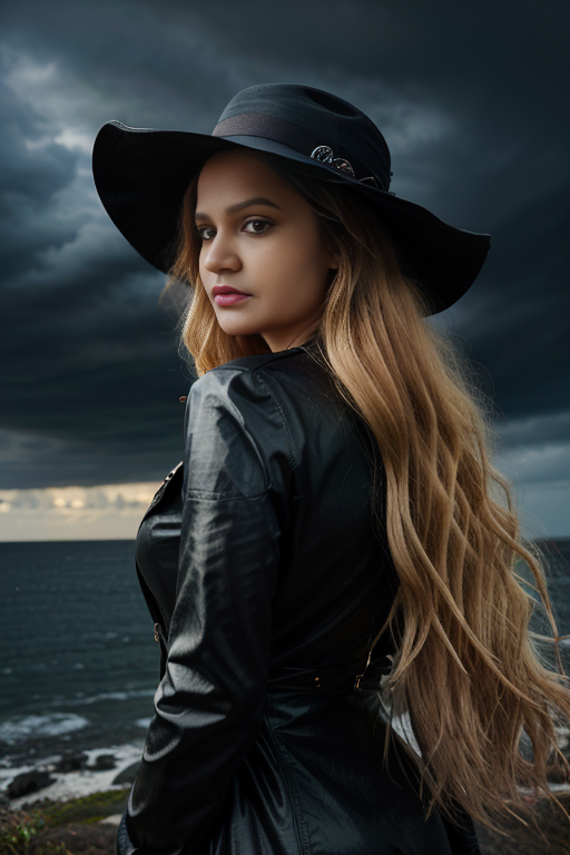 highly detailed, photorealistic digital artwork featuring a striking, statuesque woman with an ethereal, almost mythical appearance. She stands against a dramatic, dark, cloudy sky, suggesting an ominous, almost stormy atmosphere. Her skin has a porcelain complexion and she has long, wavy, golden-blonde hair cascading down her back, styled in loose waves. She wears a large, black, wide-brimmed hat adorned with intricate, twisted, branch-like designs, adding to her otherworldly aura.