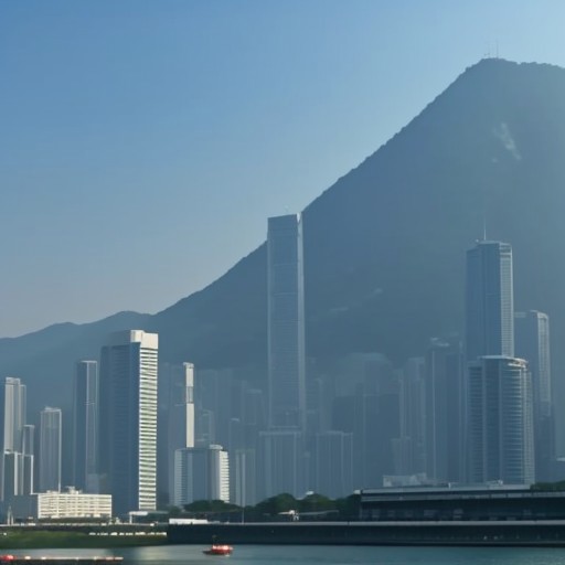 tall, narrow, tower, dystopian, black, Hong Kong, billboards, air conditioning units, short buildings around the main building, 2000s footage, nostalgic, vhs filter, construction, mountains in the background, vhs, clear