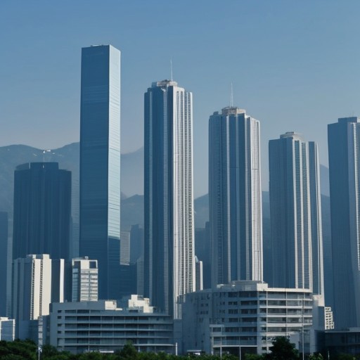 tall, narrow, tower, dystopian, black, Hong Kong, billboards, air conditioning units, short buildings around the main building, 2000s footage, nostalgic, vhs filter, construction, mountains in the background, vhs, clear