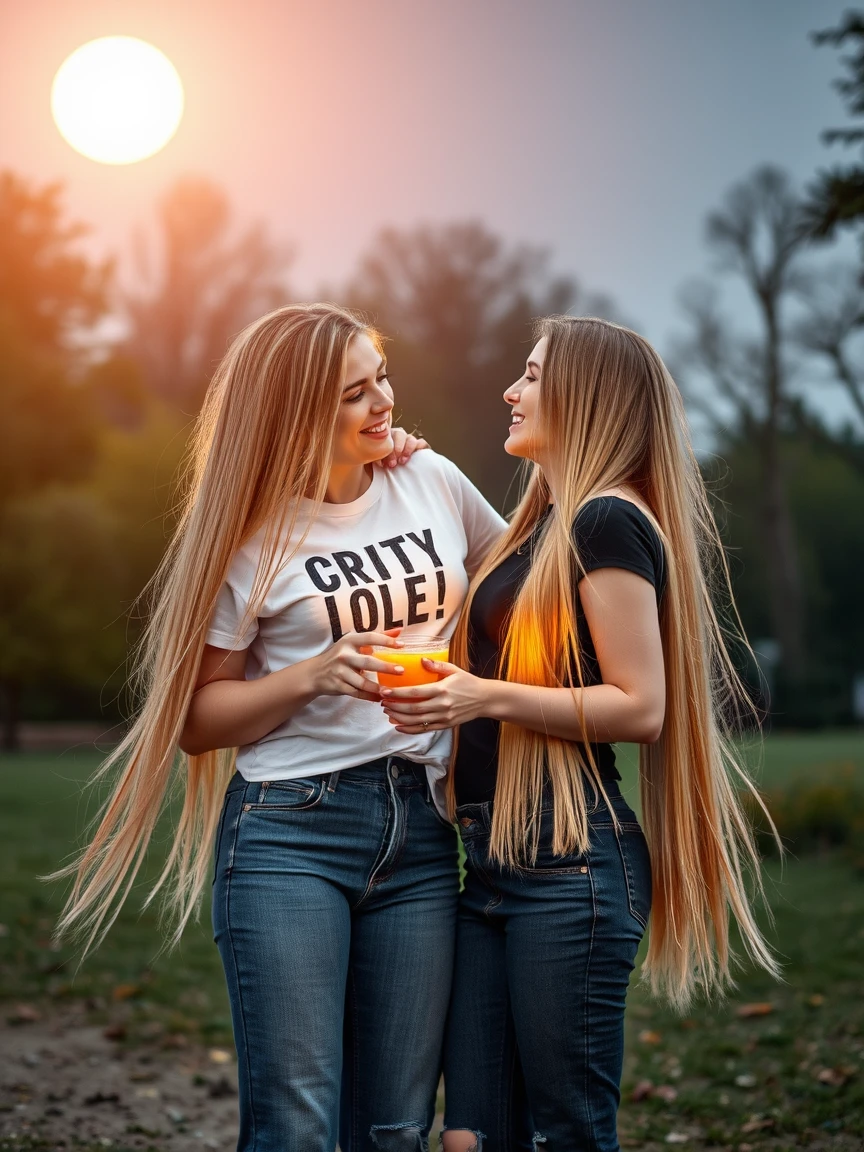 Ein hochauflösendes Foto mit viel Dynamik und Bewegungsunschärfe zeigt Cheryl und Hannah, zwei schöne, schlanke Rapunzels mit langen, glatten, blonden Haaren, sie amüsieren sich in einem Vergnügungspark, sie stehen eng umschlungen beieinander und genießen gemeinsam eine Tüte Erdbeereis, Cheryl trägt ein weißes, grafisches T-Shirt, hautenge hochgeschnittene Stretch-Jeans, ihre Freundin Hannah trägt ein einfaches schwarzes, trägerloses Top und einen silbernen, metallisch glänzenden, kunstleder Minirock, ihr langes blondes Haar reicht bis zu den Knien, warmes atmosphärisches Licht in einer glitzernden Nacht, ein großer Vollmond am Himmel sorgt für zärtlich romantische Gefühle.