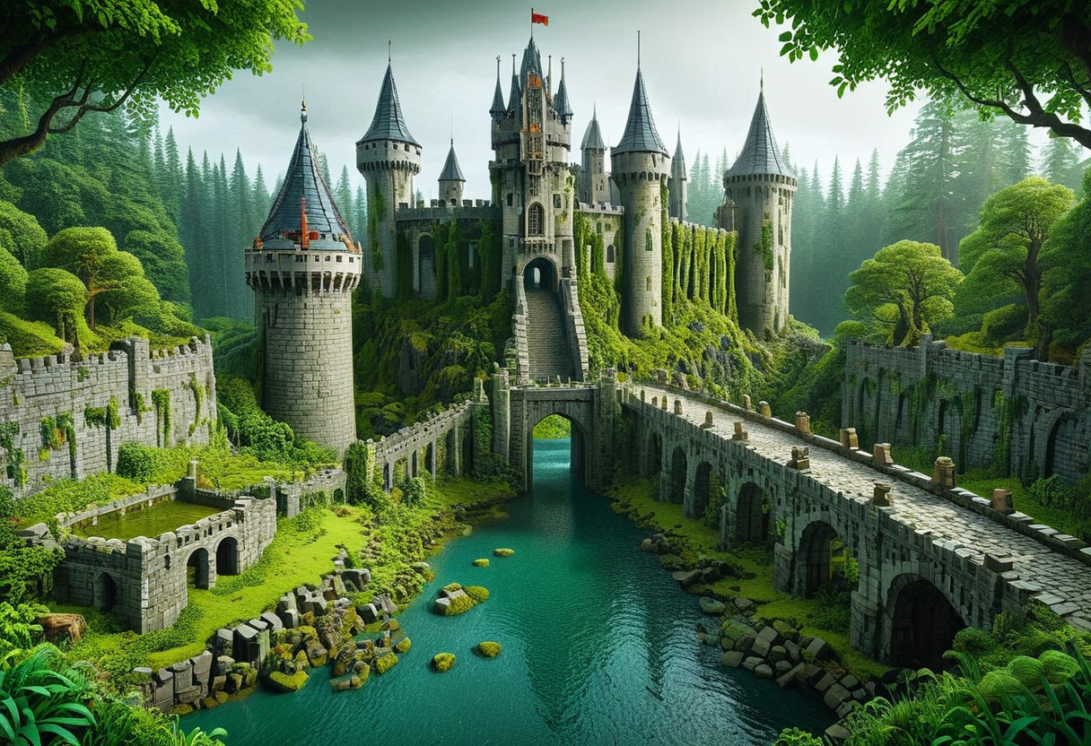 masterpiece, best quality, amazing quality, very aesthetic, amazing detail, scenery, forest tree, nature, castle, fantasy, moat, drawbridge, tower, rubble, banner, no humans, overgrown, moss,
