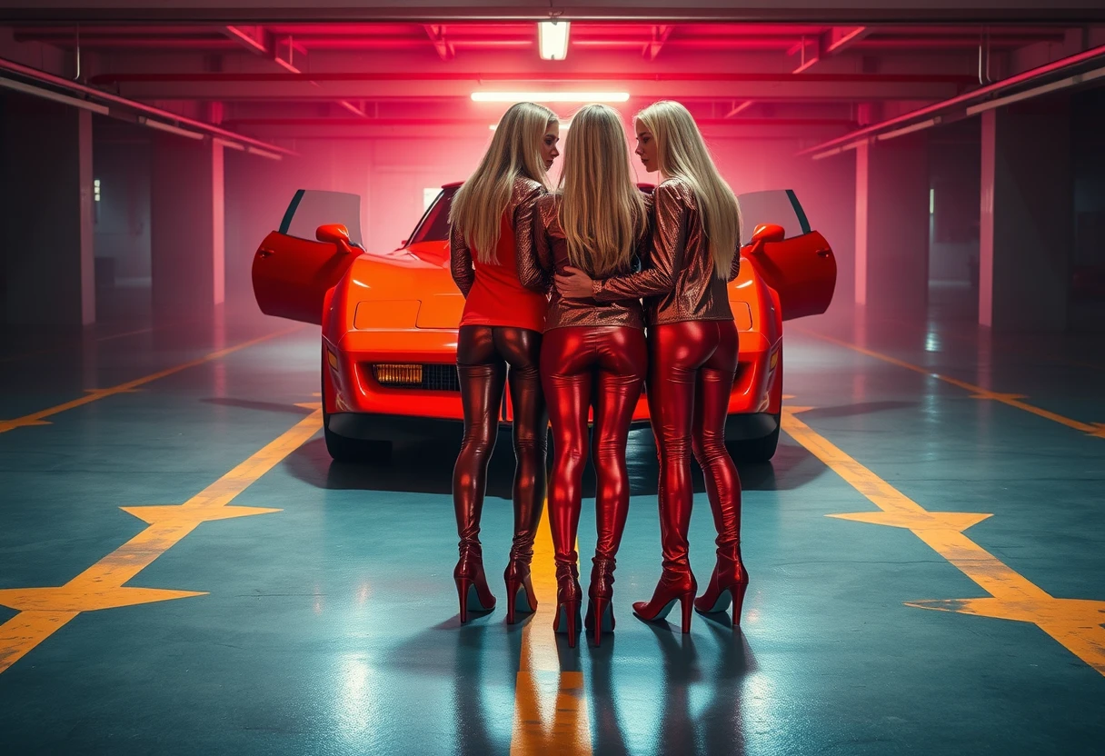 In a large underground parking garage, facing the camera a red Corvette from 1980, the headlights are shining, yellow lines and directional arrows are painted on the floor, one car door of the Corvette is open, two beautiful women, around 20, with very long blonde hair in shiny red spandex leggings and glittering silver biker jackets, siber ankle boots with heels, stand in front of the car and facing the camera, their silhouette is illuminated by the cars lights, they stand closely embraced, cool neon light is reflected on the garage floor, artificial fog creates a hazy atmosphere, the picture looks like a scene from a 80s movie, the camerap is positioned on the groun
