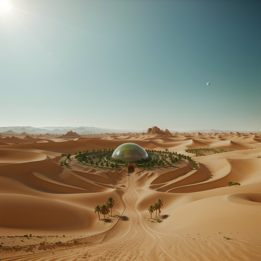 A fantasy world where a thriving green civilization is contained inside a massive transparent dome. Inside the dome/ lush forests/ rivers/ mountains/ skyscrapers/ and small towns flourish/ forming a self-contained paradise. Outside the dome/ an endless/ lifeless desert with towering sand dunes stretches infinitely/ completely barren and devoid of any signs of life. The contrast highlights the isolation of the civilization/ making the dome appear small and fragile against the vast arid wasteland.