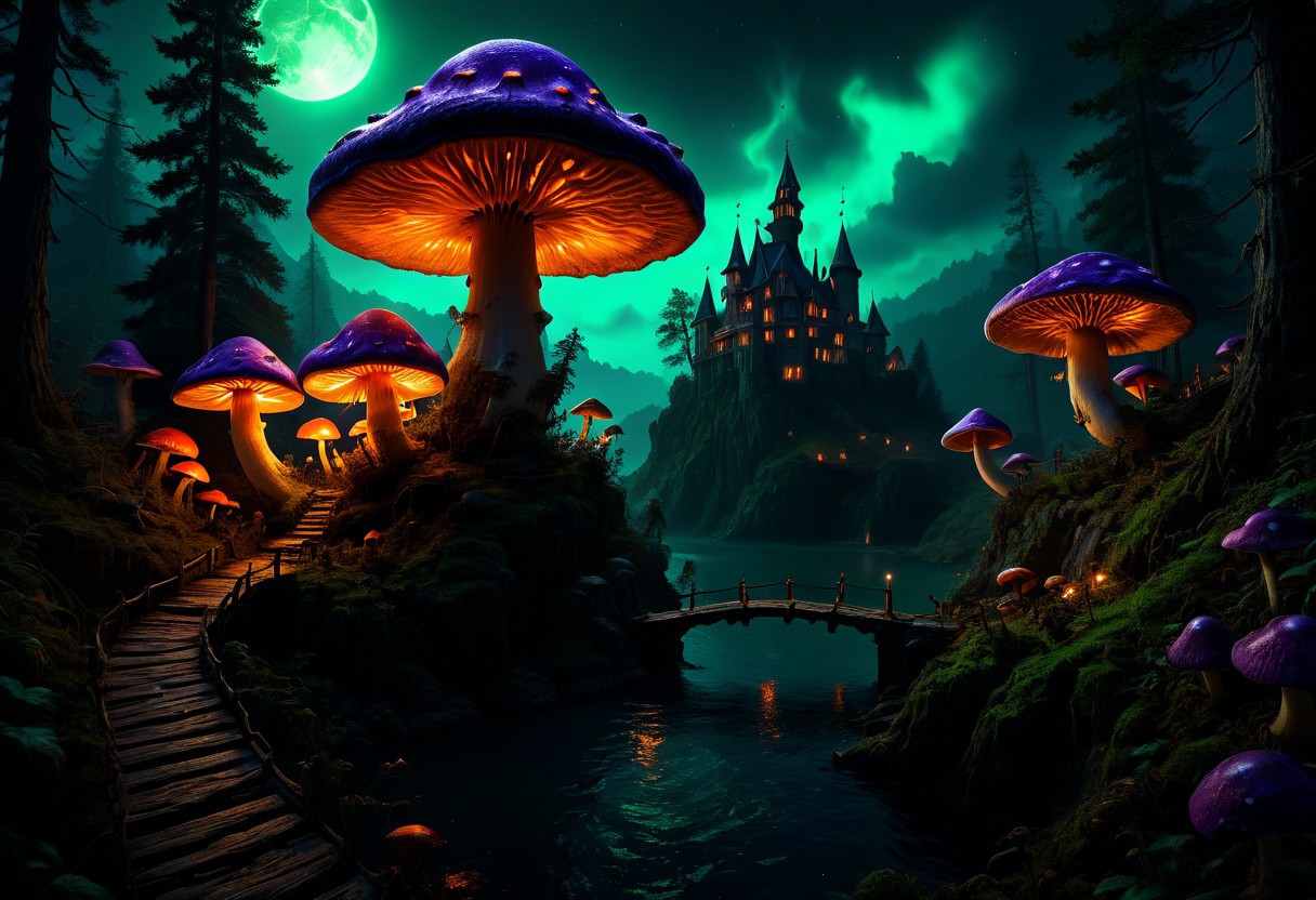 ((8k UHD very sharp and detailed photo of landscape:1.3)), gothic castle, cinematic light, deep shadows, night, dark, low light, epicly detailed scenery, aesthetic medieval settlement, ((strange creatures are walking around:1)), calm waters of lake, mushroomz, pine trees, wooden bridges, poor hats, detailed towers of castle, starry sky, moon, ((forest of detailed gigant glowing shrooms:1.3)), big mushrooms, ((magneta and green rays)), unreal world photo, ((very eerie atmosphere)), ((vivid colors||high contrast||volumetric light:1.2)), rich palette, purple, orange, dark obsidian, horror vibes, rich details, perfect composition, ((multiple silhouettes of inhabitants:1.2)), sophisticated detalization, cinematic light, professional lighting, Surreal Harmony,swirling galaxies and light trails in the background gives a dreamy feel to this moment,(dramatic chiaroscuro lighting) BREAK ral-elctryzt, dark fantasy art style, very aesthetic, ((32k UHD:1.35)), ArsMovieStill, 80s Fantasy Movie Still, (((extremely detailed sharp photo:1.4))), flux-style, mdvlCE, (((masterpiece,best quality,ultra_detailed,highres,absurdres:1.2))), <lora:neg4all_bdsqlsz_xl_V9:2>, <lora:EnvyGothicXL01:.7>,<lora:epiCPhotoXL:1>, embedding:SDXL_POS,