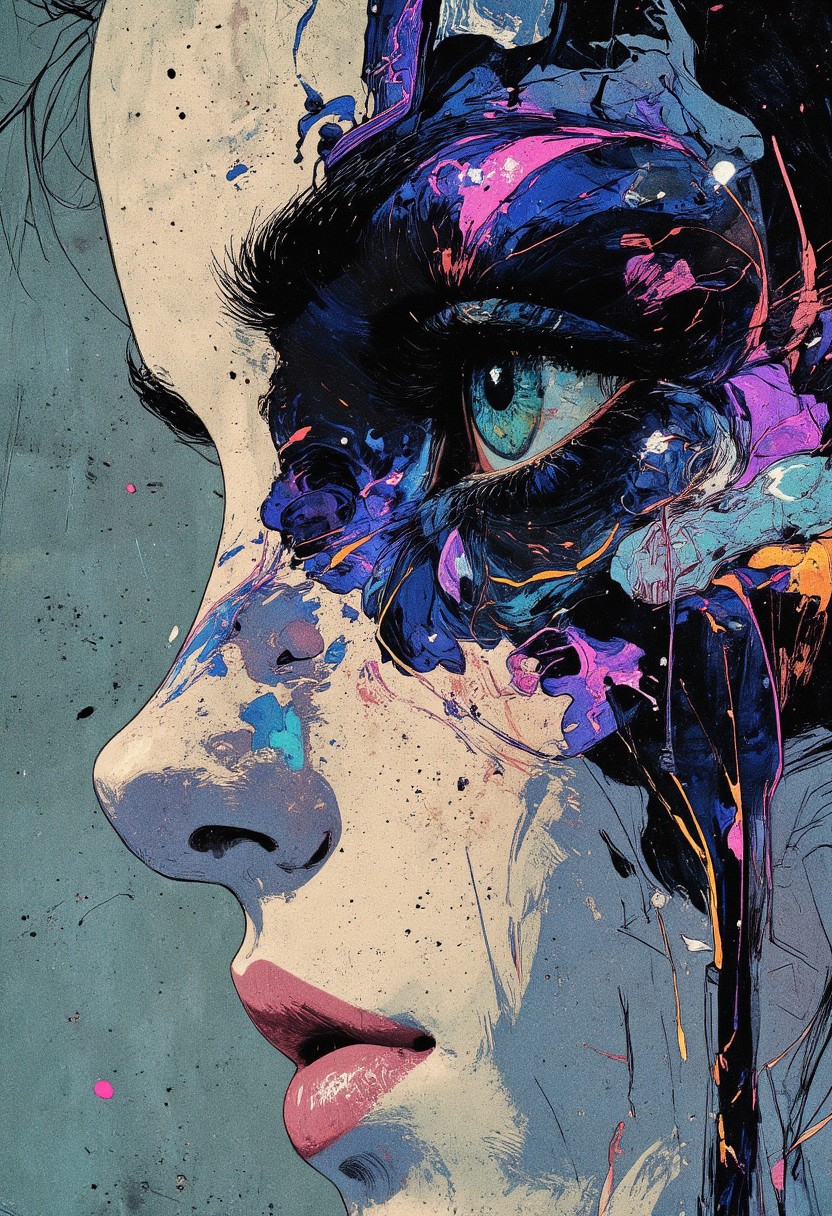 (*highly detailed, digital artwork, close-up, realism, abstract expressionism, vivid colors, dynamic movement*) A close-up of a person's face, focusing on the left eye and part of the nose, while the right side merges into an intricate abstract pattern. The eye is an intense turquoise with intricate details in the iris, pupil, and eyelashes. The nose is realistically textured and shaded, blending seamlessly into the abstract design. The abstract pattern consists of deep blue, violet, and silver streaks resembling fluid energy or lightning, with vibrant hues creating a sense of motion. The dark blue and violet tones contrast against the shimmering silver highlights. The background is a cool, desaturated gray, enhancing the prominence of the eye and abstract elements. The skin texture is smooth and highly realistic, with fine lines and shadows adding depth. The hair is depicted with delicate, intricate strokes, maintaining a balance between realism and abstraction. The overall composition merges sharp digital precision with expressive, flowing elements, blending realism with abstract energy in a striking, visually compelling image.