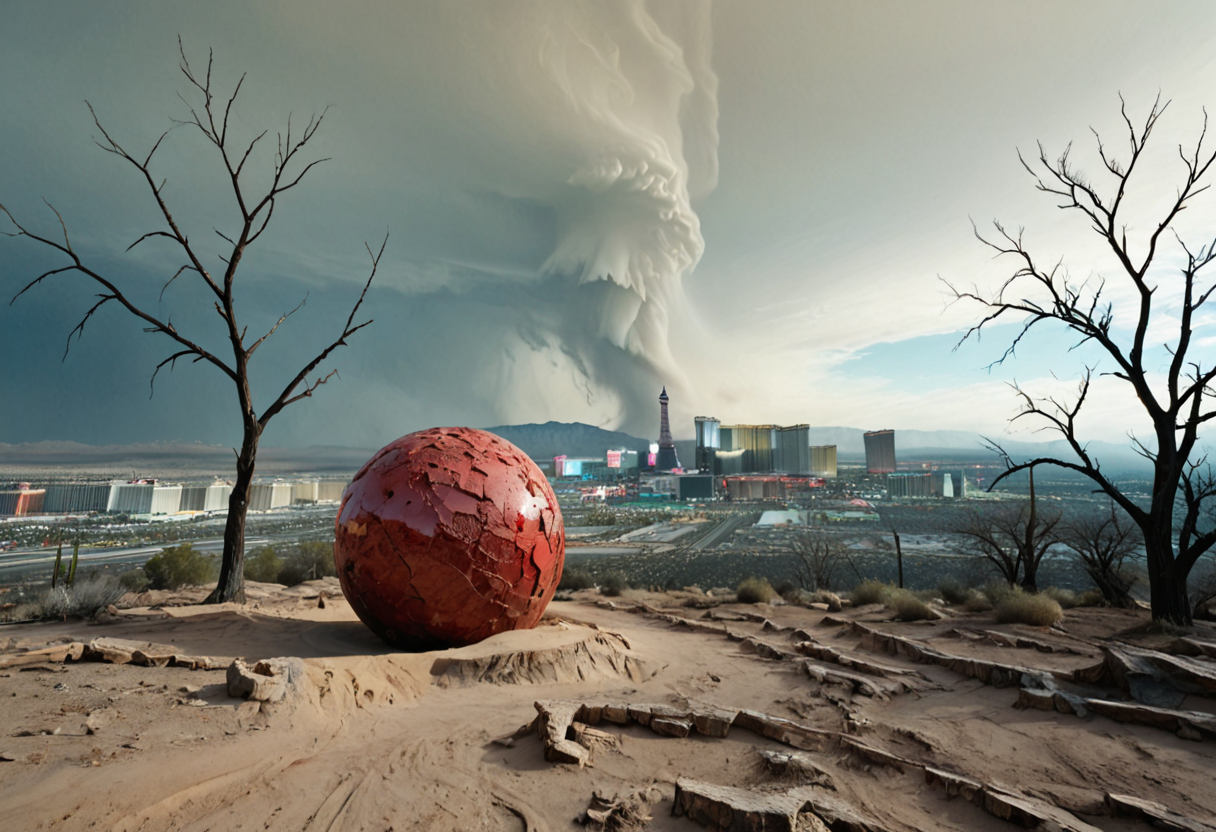 photo realistic RAW photo, high quality, Stable_Yogis_PDXL_Positives, photo from a height of a huge <lora:Mars:0.9> m4r5, rock, sand, sky, red colors, made of <lora:GeekyXL_Liquid_Marble:0.9>, in , <lora:Cyberpunk_3D:0.0> Cyb3punk vast city with Las Vegas Sphere,city skyline silhoette,tornado,<lora:0944 misty forest_v1_pony:0.9> ruanyi0944,bare tree,fog,grass