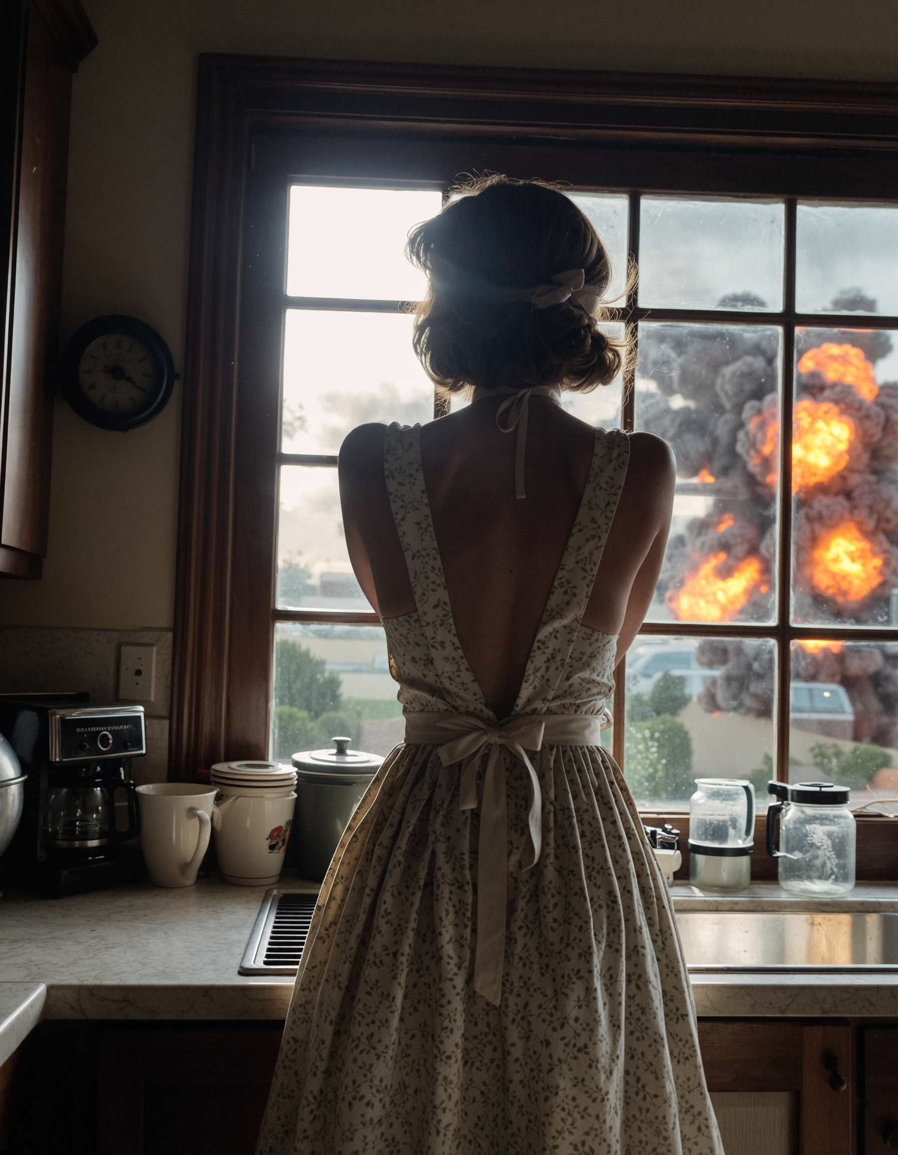 portrait, masterpiece, 4k, ray tracing, intricate details, highly-detailed, hyper-realistic, 8k RAW Editorial Photo. retro-style atomic woman from behind wearing mid-century dress and apron, standing in her kitchen, looking out the window at a giant explosion in the distance cinematic light, dramatic light, shallow depth of field, high budget, bokeh, cinemascope, film grain,