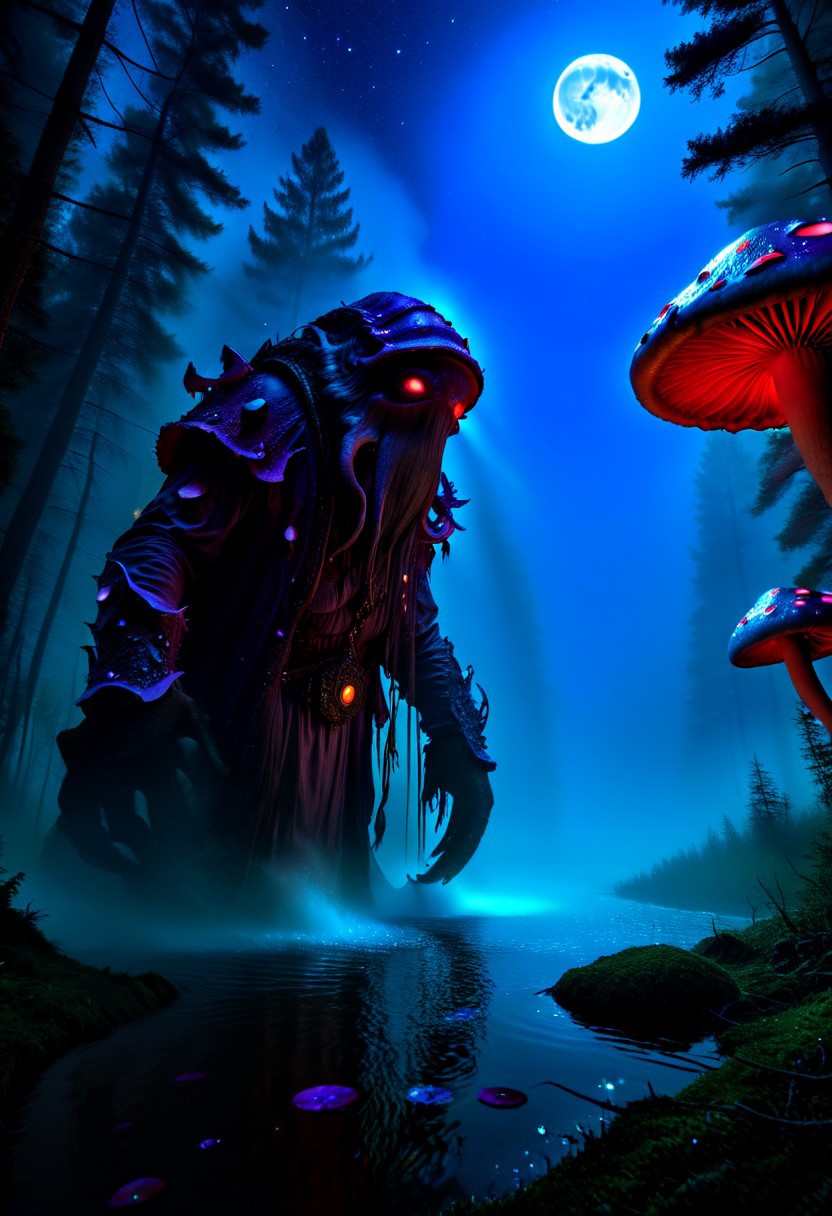 ((8k UHD very sharp and detailed photo of landscape:1.3)), Macro detailed realism style photograph, ((1monster, 1creature, ((many eyes:1.3)), alien, The robe’s hood is large and casts a shadow over most of the face, but glowing violet eyes are visible through the darkness. The entity wears a mask crafted from multicolored shimmering Crystal, Mask, with a smooth surface and two simple eye holes glowing faintly in purple. The entity exudes an aura of mystery and power, with an ethereal and dream-like appearance. The edges of the cloak seem to dissolve into a misty, cosmic energy, and faint, glowing symbols swirl around its form like drifting constellations)), demonic creature, cinematic light, deep shadows, night, dark, low light, epicly detailed scenery, aesthetic medieval settlement, ((strange creatures are walking around:1)), calm waters of lake, mushroomz, pine trees, wooden bridges, poor hats, starry sky, moon, monsterlora, ((forest of detailed gigant glowing shrooms:1.3)), big mushrooms, ((magneta and green rays)), unreal world photo, ((very eerie atmosphere)), ((vivid colors||high contrast||volumetric light:1.2)), BREAK science fiction, (((extremely detailed sharp photo:1.4))),(((masterpiece,best quality,ultra_detailed,highres,absurdres:1.2))), <lora:neg4all_bdsqlsz_xl_V9:2>, embedding:SDXL_POS,