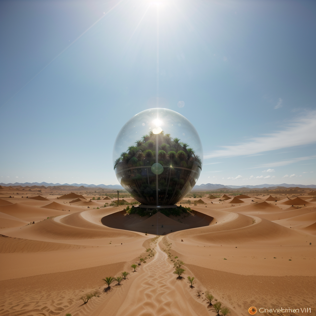 A fantasy world where a thriving green civilization is contained inside a massive transparent dome. Inside the dome/ lush forests rivers mountains skyscrapers and small towns flourish forming a self-contained paradise. Outside the dome an endless lifeless desert with towering sand dunes stretches infinitely completely barren and devoid of any signs of life. The contrast highlights the isolation of the civilization making the dome appear small and fragile against the vast arid wasteland.