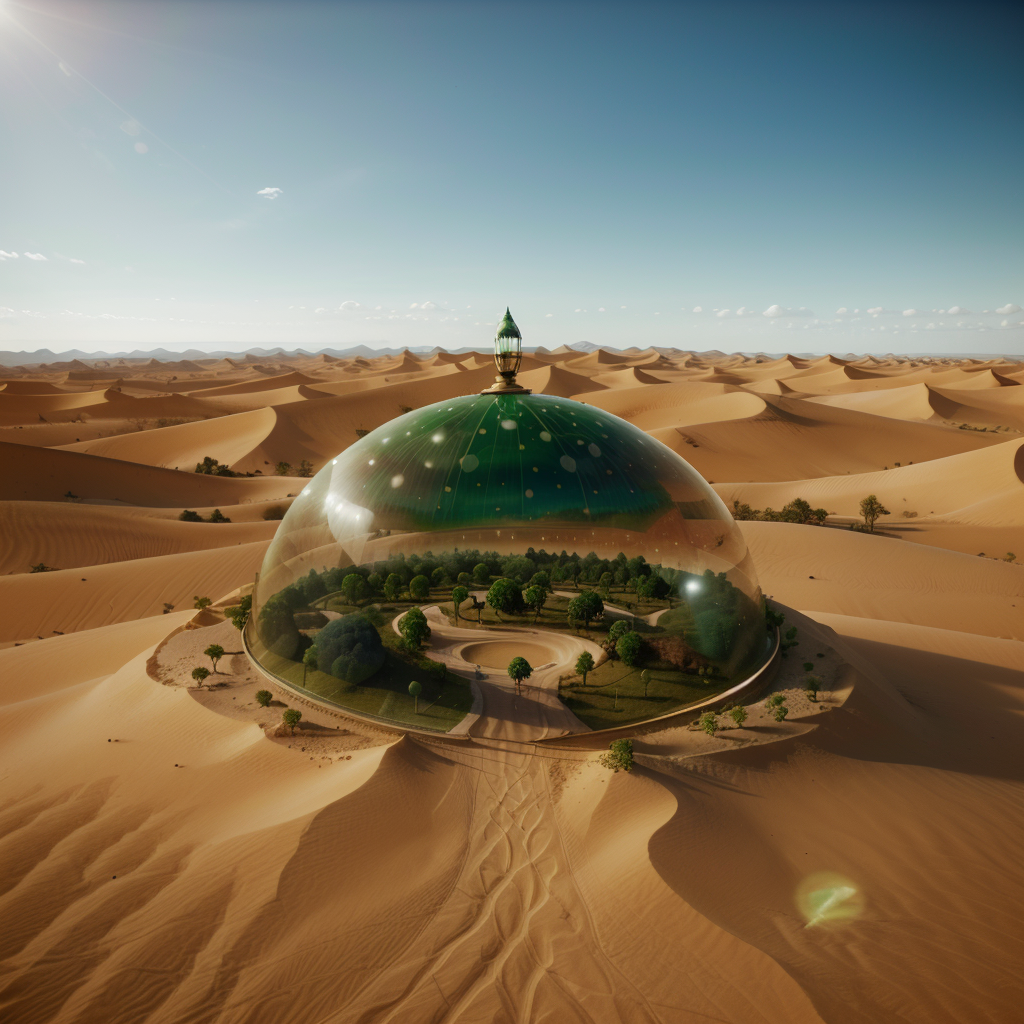 A fantasy world where a thriving green civilization is contained inside a massive transparent dome. Inside the dome/ lush forests rivers mountains skyscrapers and small towns flourish forming a self-contained paradise. Outside the dome an endless lifeless desert with towering sand dunes stretches infinitely completely barren and devoid of any signs of life. The contrast highlights the isolation of the civilization making the dome appear small and fragile against the vast arid wasteland.